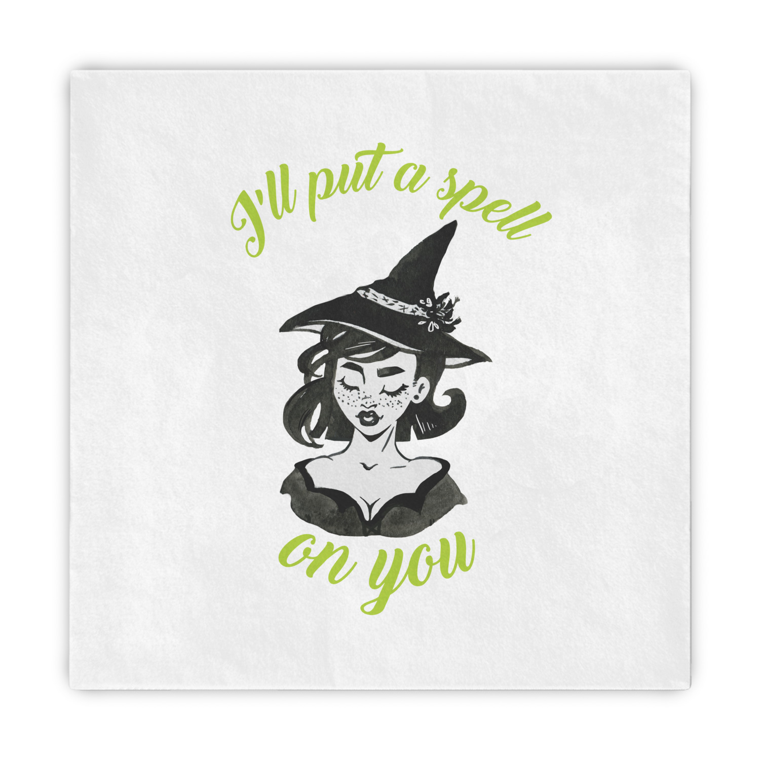This fun design has a dark violet velvet looking (not real velvet - digital) background. On top of the digital velvet is a pattern full of beautiful illustrations of witches, potions, black cats, bats, and more. The main design is split in two with this background on one side and a plain violet digital velvet on the other. Your personalization is placed in the bottom right corner to give a lovely asymmetrical look. The coordinating design has a gorgeous large illustration of a witch with a little saying above and below her that says "I'll put a spell on you."
