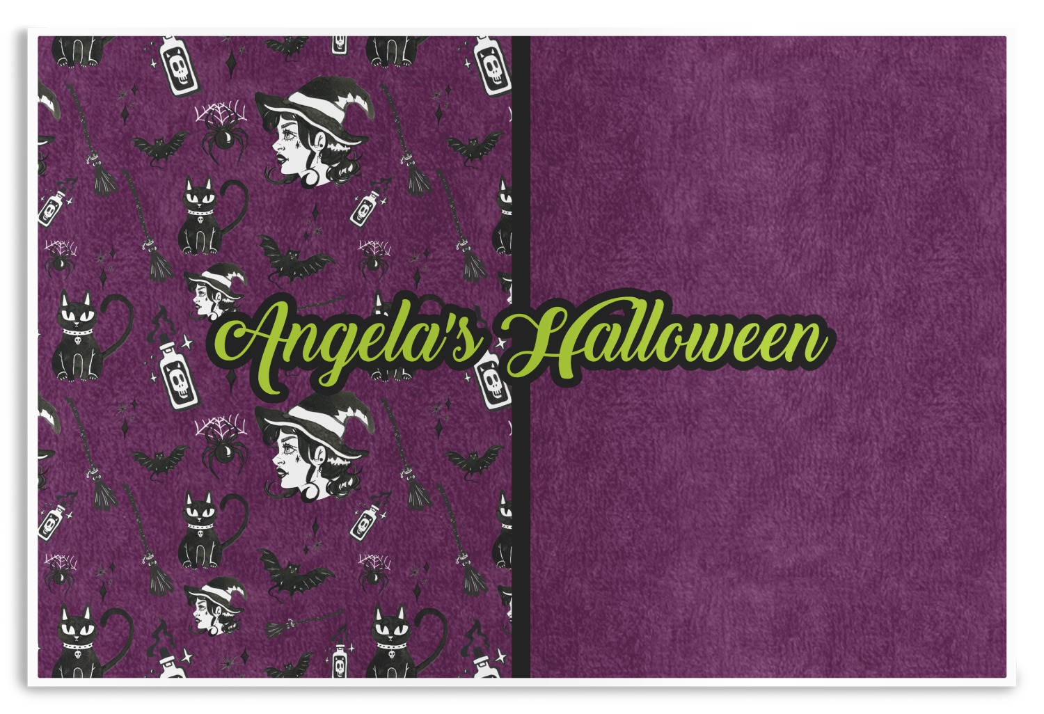 This fun design has a dark violet velvet looking (not real velvet - digital) background. On top of the digital velvet is a pattern full of beautiful illustrations of witches, potions, black cats, bats, and more. The main design is split in two with this background on one side and a plain violet digital velvet on the other. Your personalization is placed in the bottom right corner to give a lovely asymmetrical look. The coordinating design has a gorgeous large illustration of a witch with a little saying above and below her that says "I'll put a spell on you."