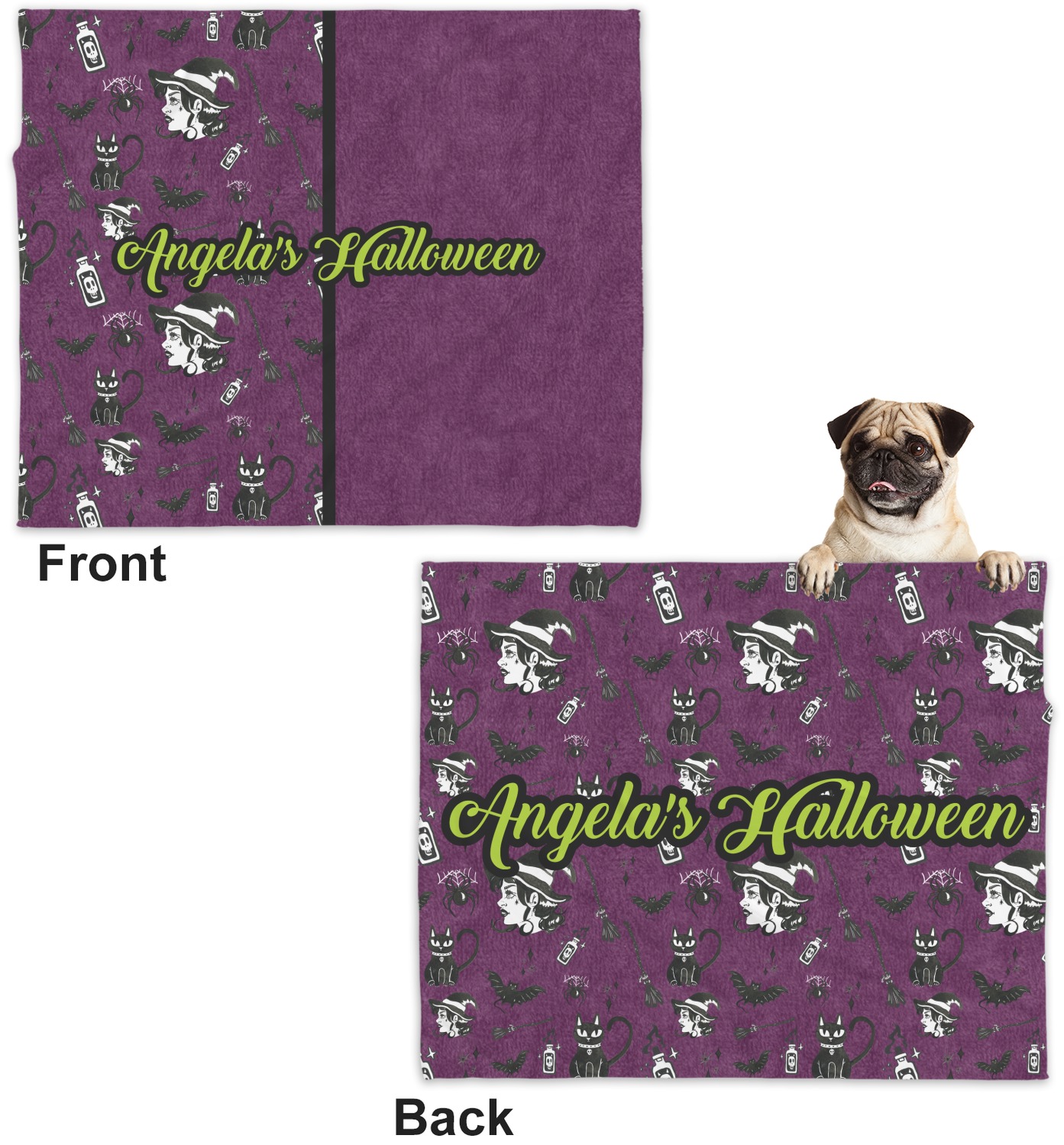 These dog blankets are crafted from a gentle, soft-to-the-touch, minky material. We print your customizations, either matching or differing, on both the top and underside of the blanket. These personalized dog blankets are available in two sizes: regular and large. Our regular size, at 40" x 30", accommodates small and some medium size dogs. At 60" x 50", our large dog blanket is a better fit for bigger breeds. Though specialized for dogs, these blankets still make a thoughtful gift for your favorite feline, or any other pet in mind!