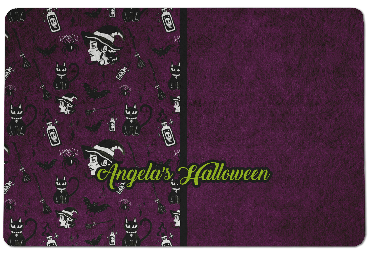 This fun design has a dark violet velvet looking (not real velvet - digital) background. On top of the digital velvet is a pattern full of beautiful illustrations of witches, potions, black cats, bats, and more. The main design is split in two with this background on one side and a plain violet digital velvet on the other. Your personalization is placed in the bottom right corner to give a lovely asymmetrical look. The coordinating design has a gorgeous large illustration of a witch with a little saying above and below her that says "I'll put a spell on you."