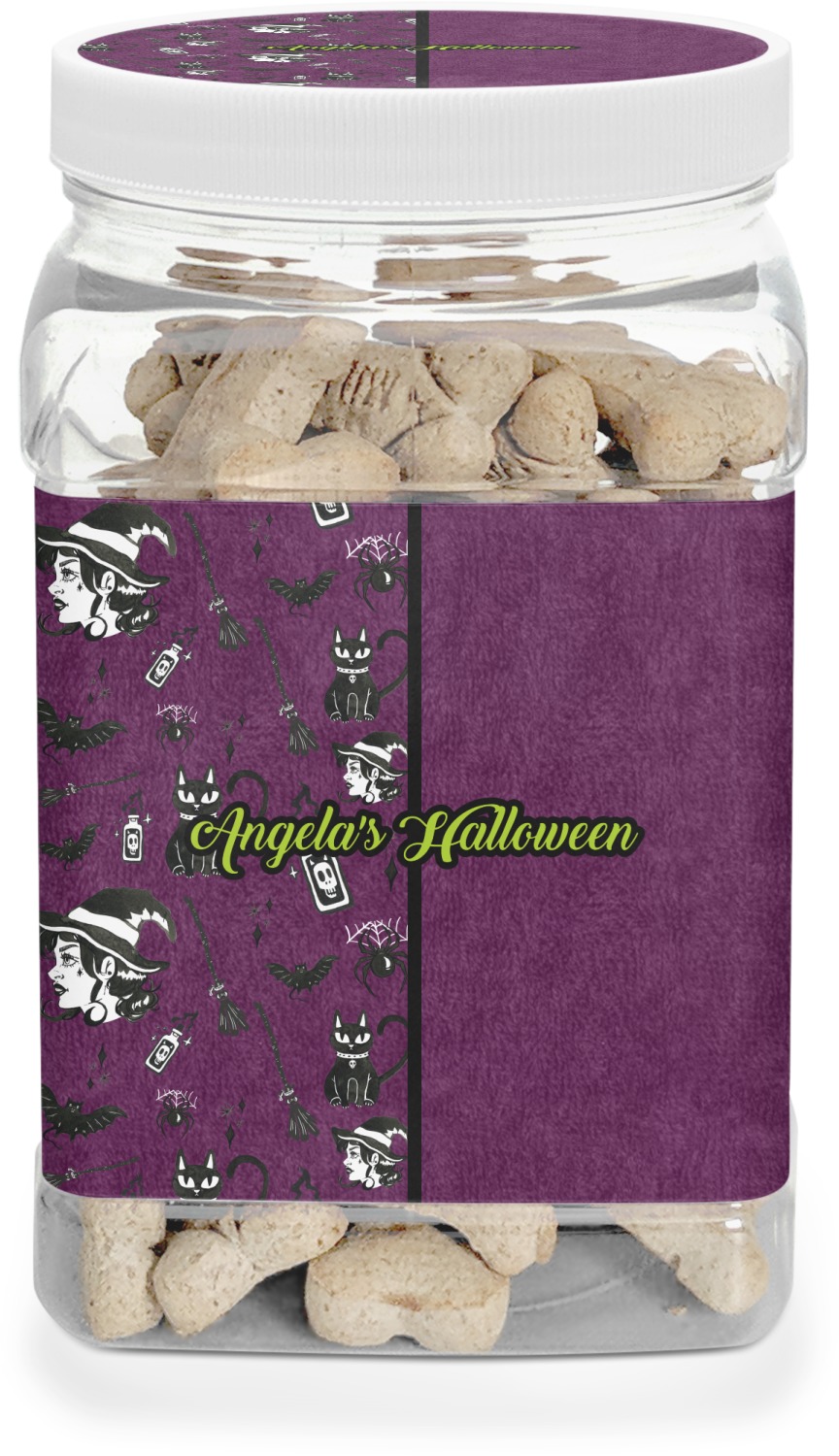 This half gallon jar, made from a sturdy plastic, is the perfect way to keep treats from any naughty pet paws, while still keeping them ready on hand for when your pup performs an impressive trick. This dog cookie jar features a screw-on, white lid that displays your personalized design on a vinyl sticker. We apply another customized sticker that wraps around the front and sides of the jar. Our dog treat jar also has indentations on the rear ends of the sides, which allows for convenient handling, and its square frame allows for easy storage.
