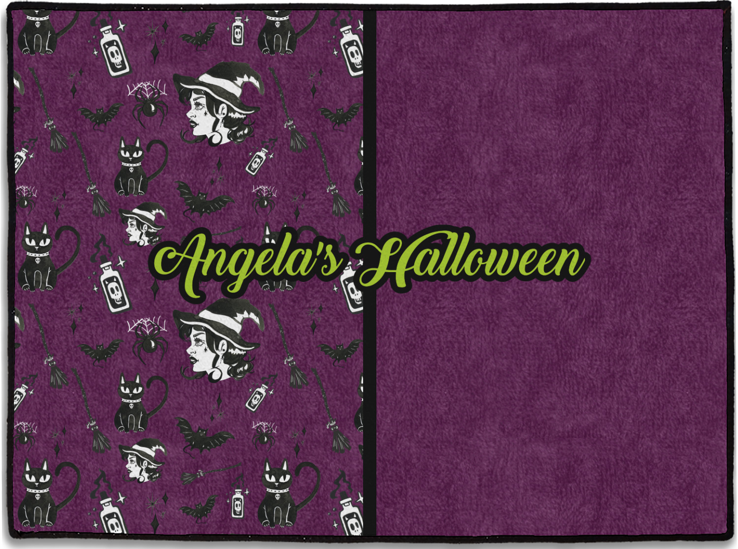 This fun design has a dark violet velvet looking (not real velvet - digital) background. On top of the digital velvet is a pattern full of beautiful illustrations of witches, potions, black cats, bats, and more. The main design is split in two with this background on one side and a plain violet digital velvet on the other. Your personalization is placed in the bottom right corner to give a lovely asymmetrical look. The coordinating design has a gorgeous large illustration of a witch with a little saying above and below her that says "I'll put a spell on you."