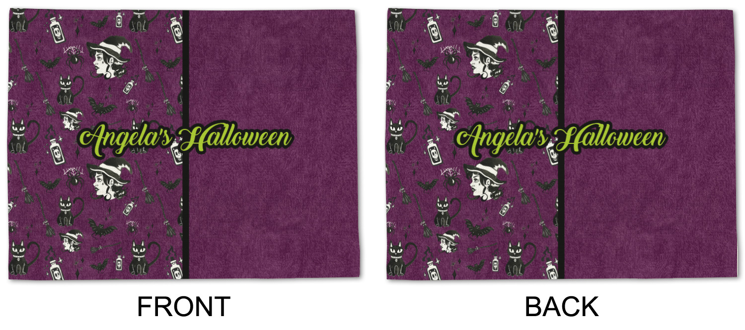 This fun design has a dark violet velvet looking (not real velvet - digital) background. On top of the digital velvet is a pattern full of beautiful illustrations of witches, potions, black cats, bats, and more. The main design is split in two with this background on one side and a plain violet digital velvet on the other. Your personalization is placed in the bottom right corner to give a lovely asymmetrical look. The coordinating design has a gorgeous large illustration of a witch with a little saying above and below her that says "I'll put a spell on you."