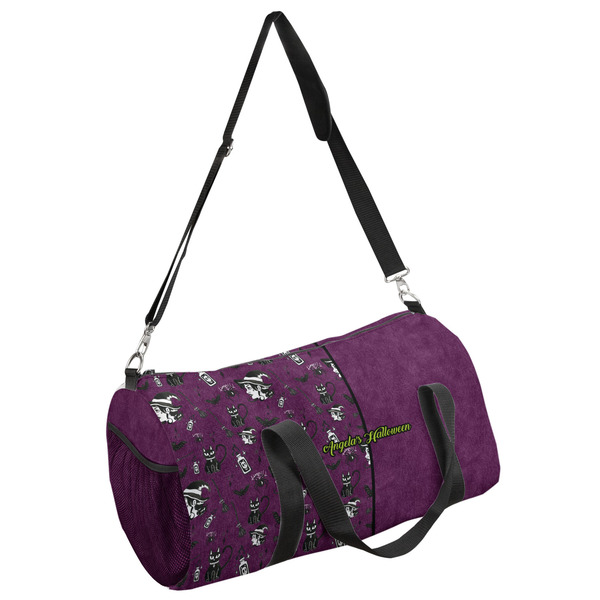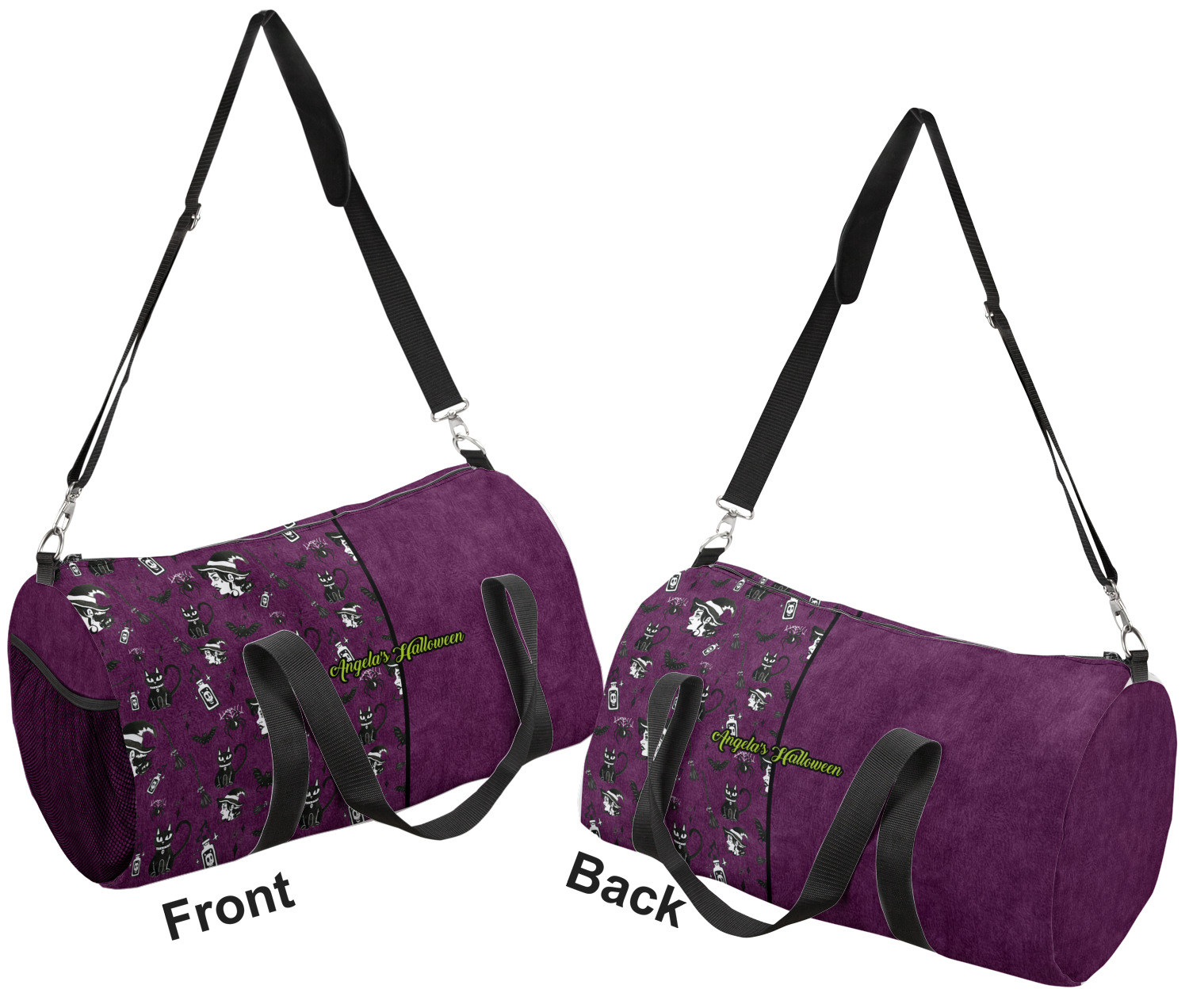 This duffle is a sturdy bag made of a canvas material. It comes in two sizes: Small (19"W x 9.5"H x 9.5"D) and Large (23"W x 12"H x 12"D). The bag is a cylindrical shape with a black adjustable strap and two handles. On one side is an elastic pouch to put a waterbottle or other small item. Your product will be sublimated with your design and is able to be designed on the front, back, and sides. Be sure to remember that the straps may cut into parts of your design if you upload your own artwork.