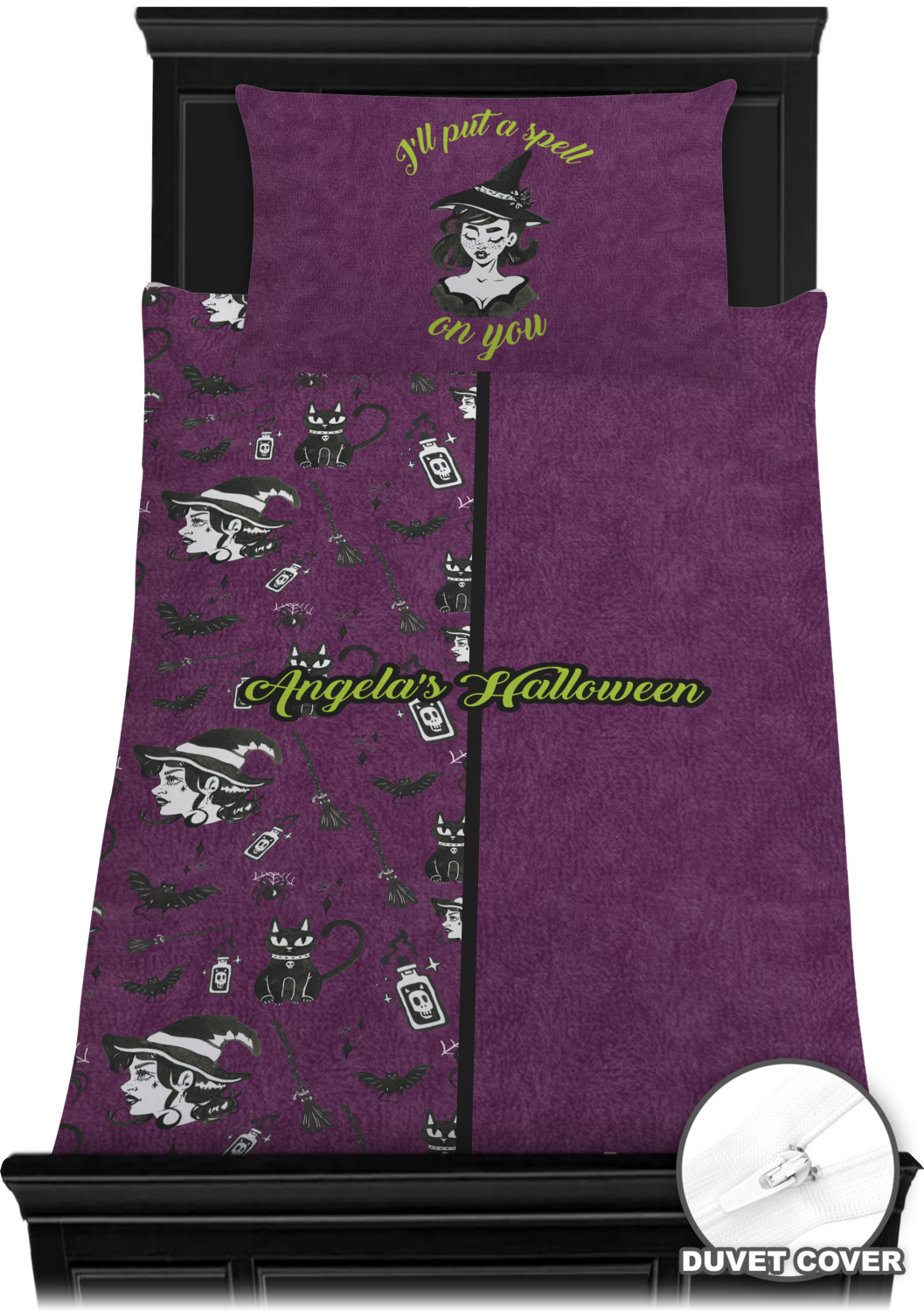 This fun design has a dark violet velvet looking (not real velvet - digital) background. On top of the digital velvet is a pattern full of beautiful illustrations of witches, potions, black cats, bats, and more. The main design is split in two with this background on one side and a plain violet digital velvet on the other. Your personalization is placed in the bottom right corner to give a lovely asymmetrical look. The coordinating design has a gorgeous large illustration of a witch with a little saying above and below her that says "I'll put a spell on you."