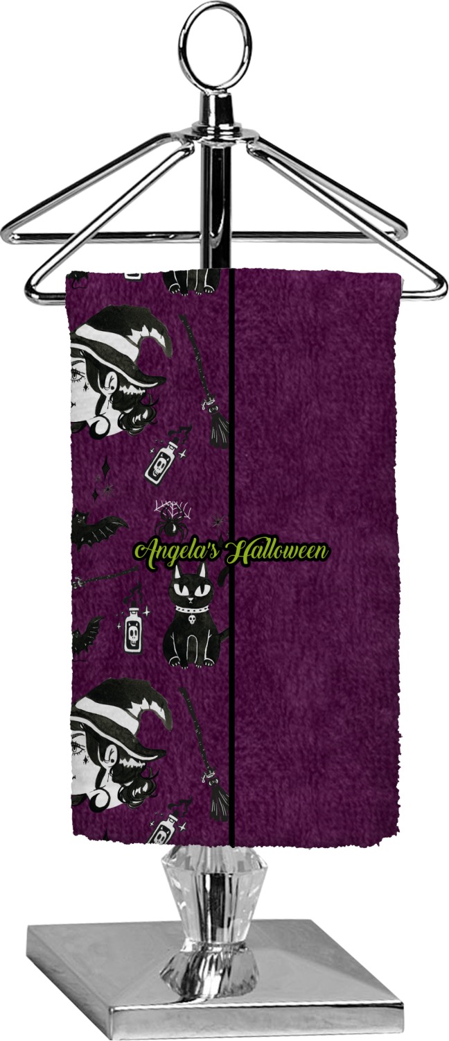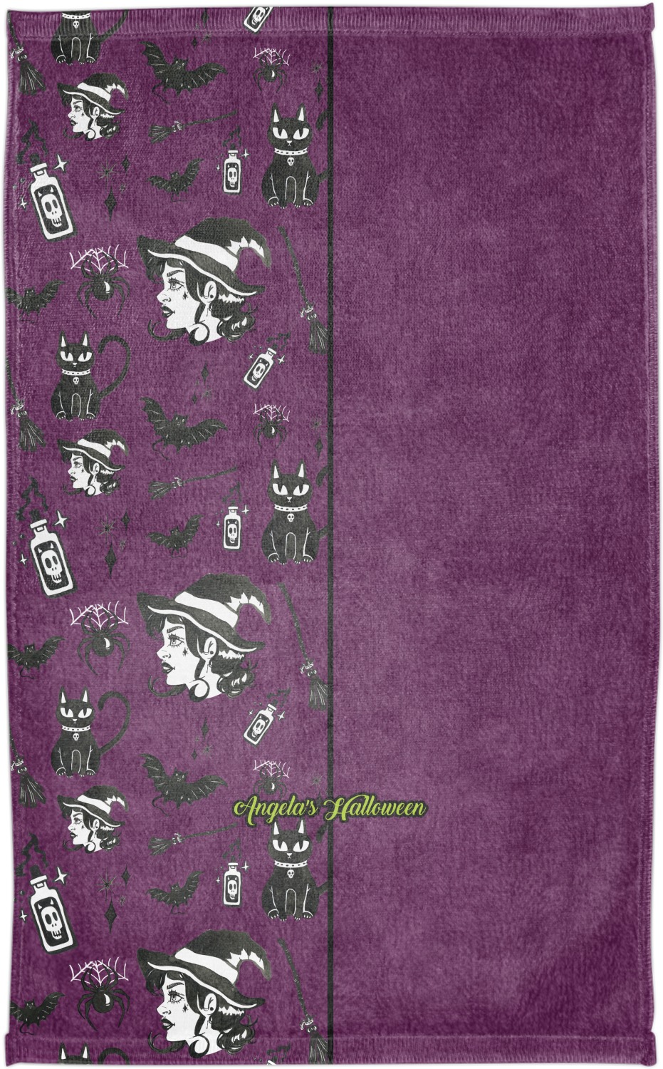 This fun design has a dark violet velvet looking (not real velvet - digital) background. On top of the digital velvet is a pattern full of beautiful illustrations of witches, potions, black cats, bats, and more. The main design is split in two with this background on one side and a plain violet digital velvet on the other. Your personalization is placed in the bottom right corner to give a lovely asymmetrical look. The coordinating design has a gorgeous large illustration of a witch with a little saying above and below her that says "I'll put a spell on you."