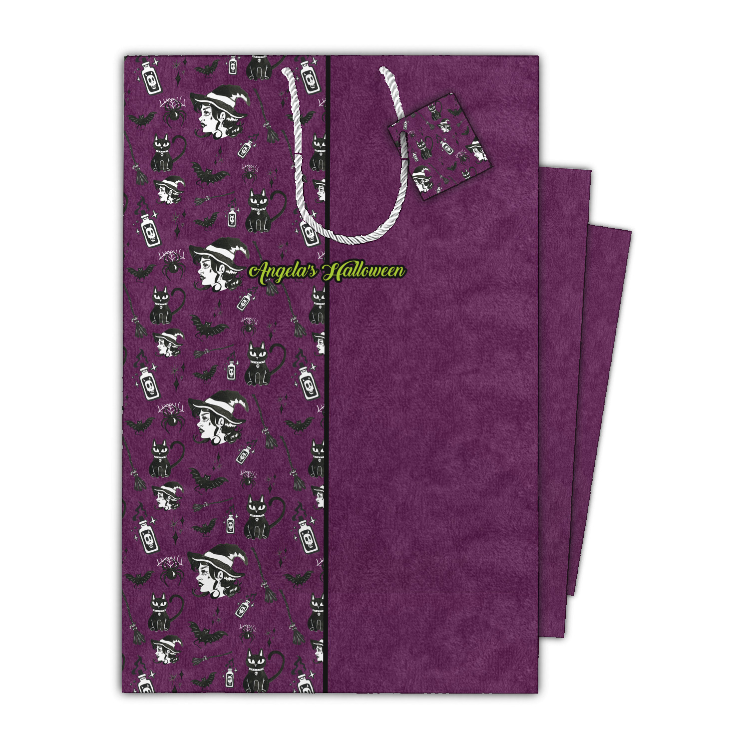 This fun design has a dark violet velvet looking (not real velvet - digital) background. On top of the digital velvet is a pattern full of beautiful illustrations of witches, potions, black cats, bats, and more. The main design is split in two with this background on one side and a plain violet digital velvet on the other. Your personalization is placed in the bottom right corner to give a lovely asymmetrical look. The coordinating design has a gorgeous large illustration of a witch with a little saying above and below her that says "I'll put a spell on you."