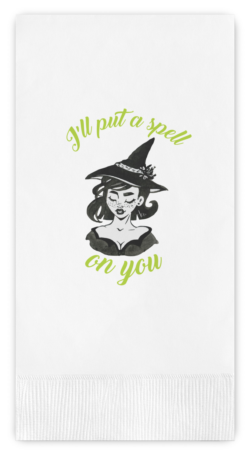 This fun design has a dark violet velvet looking (not real velvet - digital) background. On top of the digital velvet is a pattern full of beautiful illustrations of witches, potions, black cats, bats, and more. The main design is split in two with this background on one side and a plain violet digital velvet on the other. Your personalization is placed in the bottom right corner to give a lovely asymmetrical look. The coordinating design has a gorgeous large illustration of a witch with a little saying above and below her that says "I'll put a spell on you."