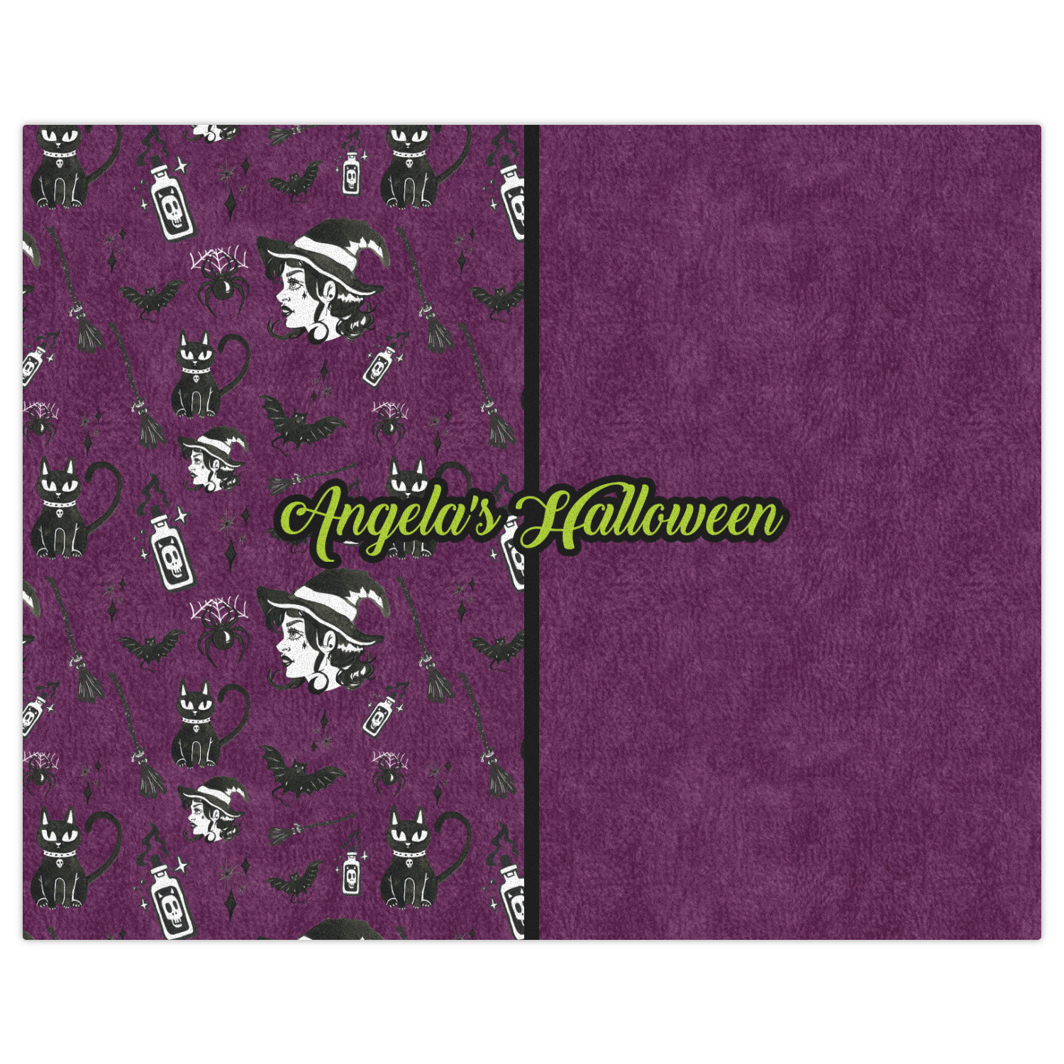 This fun design has a dark violet velvet looking (not real velvet - digital) background. On top of the digital velvet is a pattern full of beautiful illustrations of witches, potions, black cats, bats, and more. The main design is split in two with this background on one side and a plain violet digital velvet on the other. Your personalization is placed in the bottom right corner to give a lovely asymmetrical look. The coordinating design has a gorgeous large illustration of a witch with a little saying above and below her that says "I'll put a spell on you."