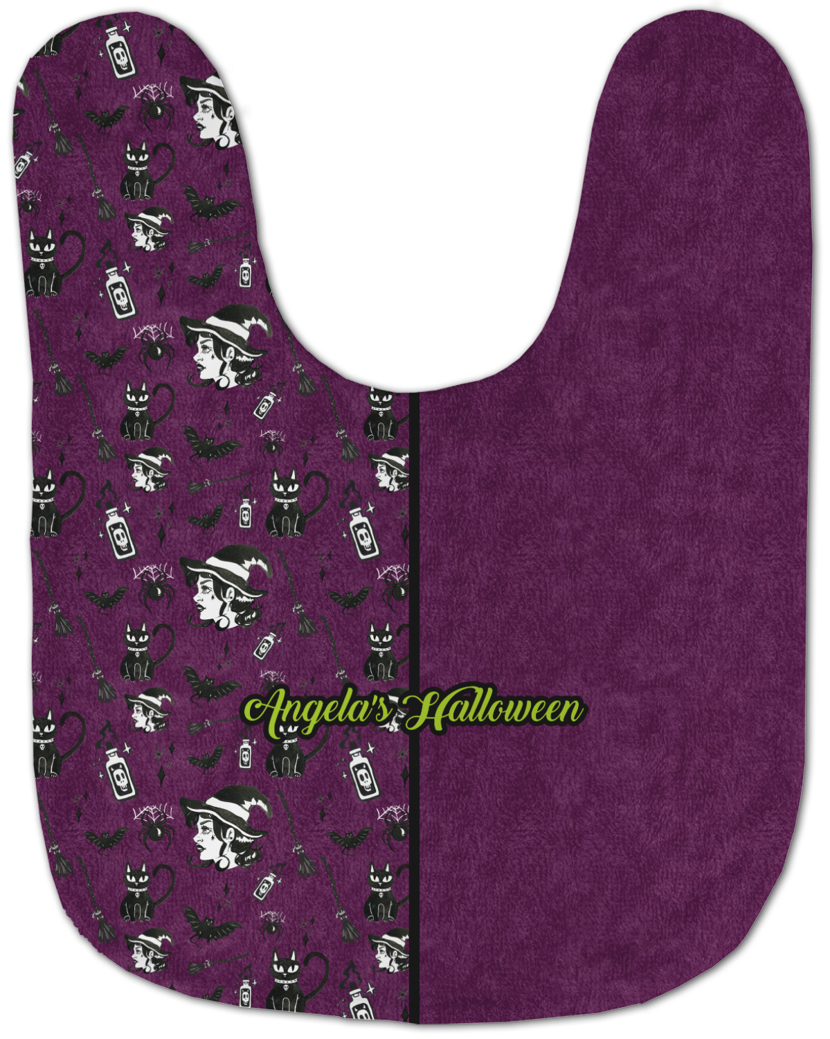 This fun design has a dark violet velvet looking (not real velvet - digital) background. On top of the digital velvet is a pattern full of beautiful illustrations of witches, potions, black cats, bats, and more. The main design is split in two with this background on one side and a plain violet digital velvet on the other. Your personalization is placed in the bottom right corner to give a lovely asymmetrical look. The coordinating design has a gorgeous large illustration of a witch with a little saying above and below her that says "I'll put a spell on you."