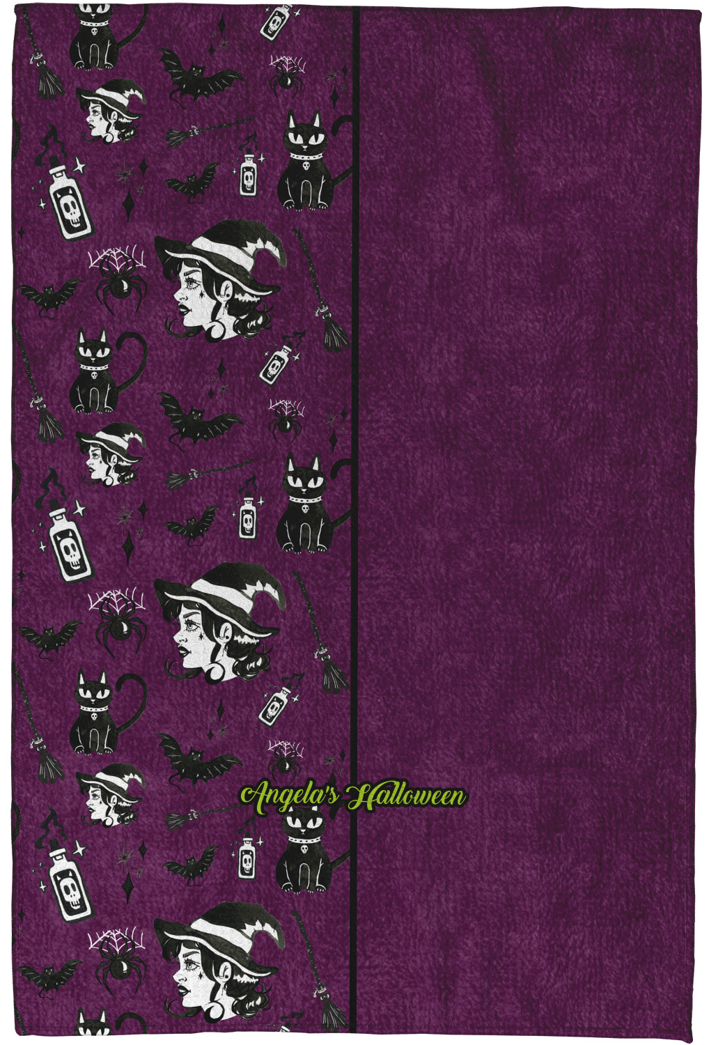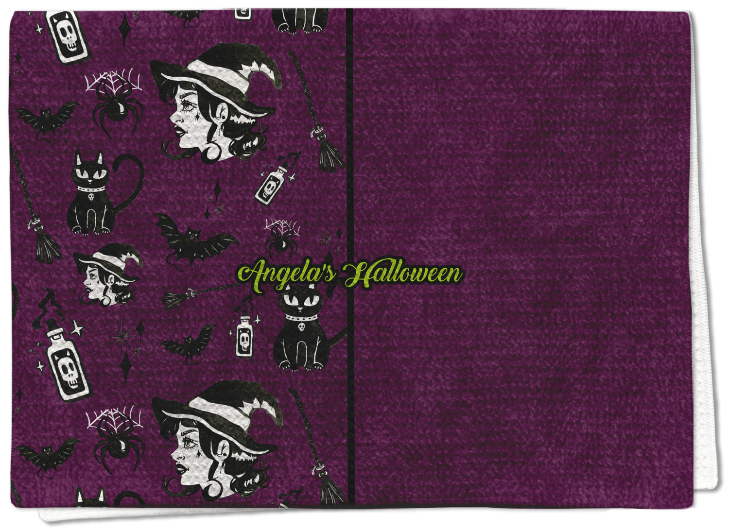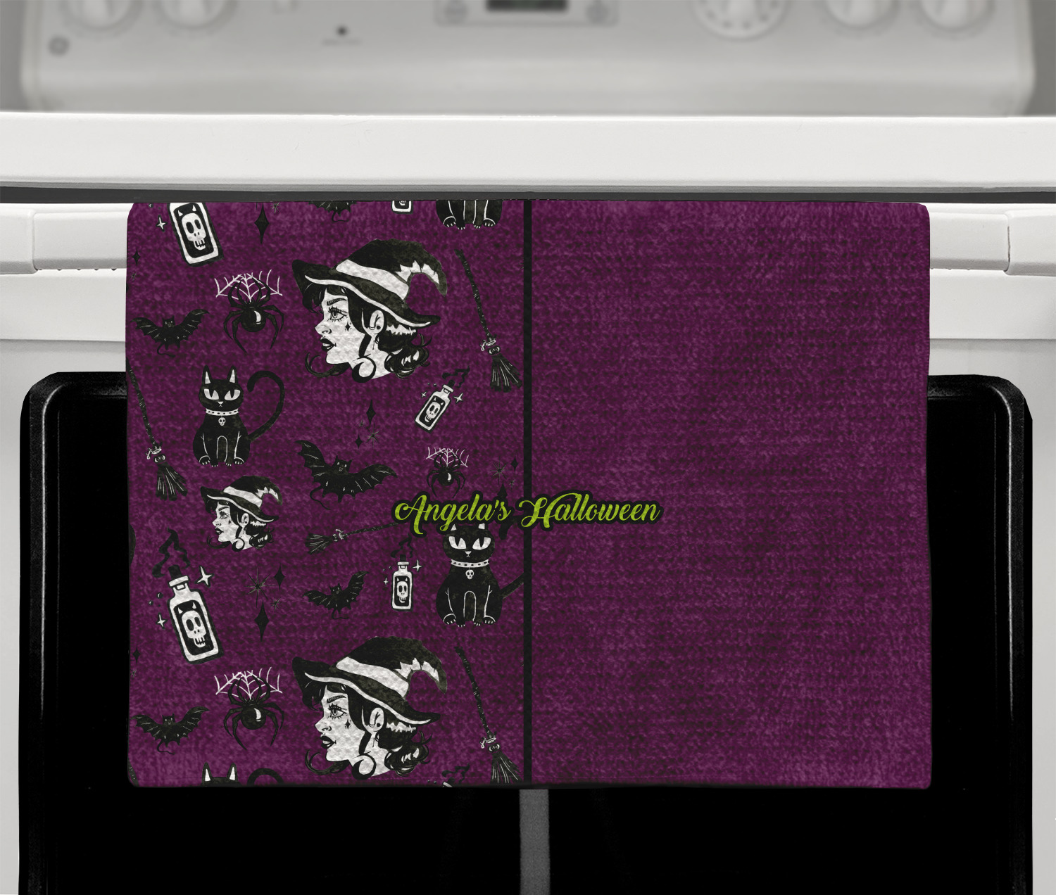 This fun design has a dark violet velvet looking (not real velvet - digital) background. On top of the digital velvet is a pattern full of beautiful illustrations of witches, potions, black cats, bats, and more. The main design is split in two with this background on one side and a plain violet digital velvet on the other. Your personalization is placed in the bottom right corner to give a lovely asymmetrical look. The coordinating design has a gorgeous large illustration of a witch with a little saying above and below her that says "I'll put a spell on you."