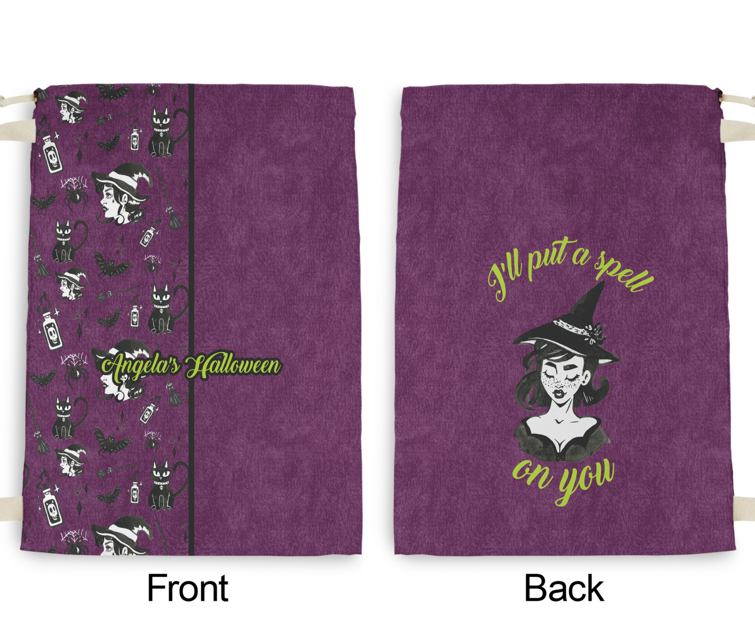 This fun design has a dark violet velvet looking (not real velvet - digital) background. On top of the digital velvet is a pattern full of beautiful illustrations of witches, potions, black cats, bats, and more. The main design is split in two with this background on one side and a plain violet digital velvet on the other. Your personalization is placed in the bottom right corner to give a lovely asymmetrical look. The coordinating design has a gorgeous large illustration of a witch with a little saying above and below her that says "I'll put a spell on you."