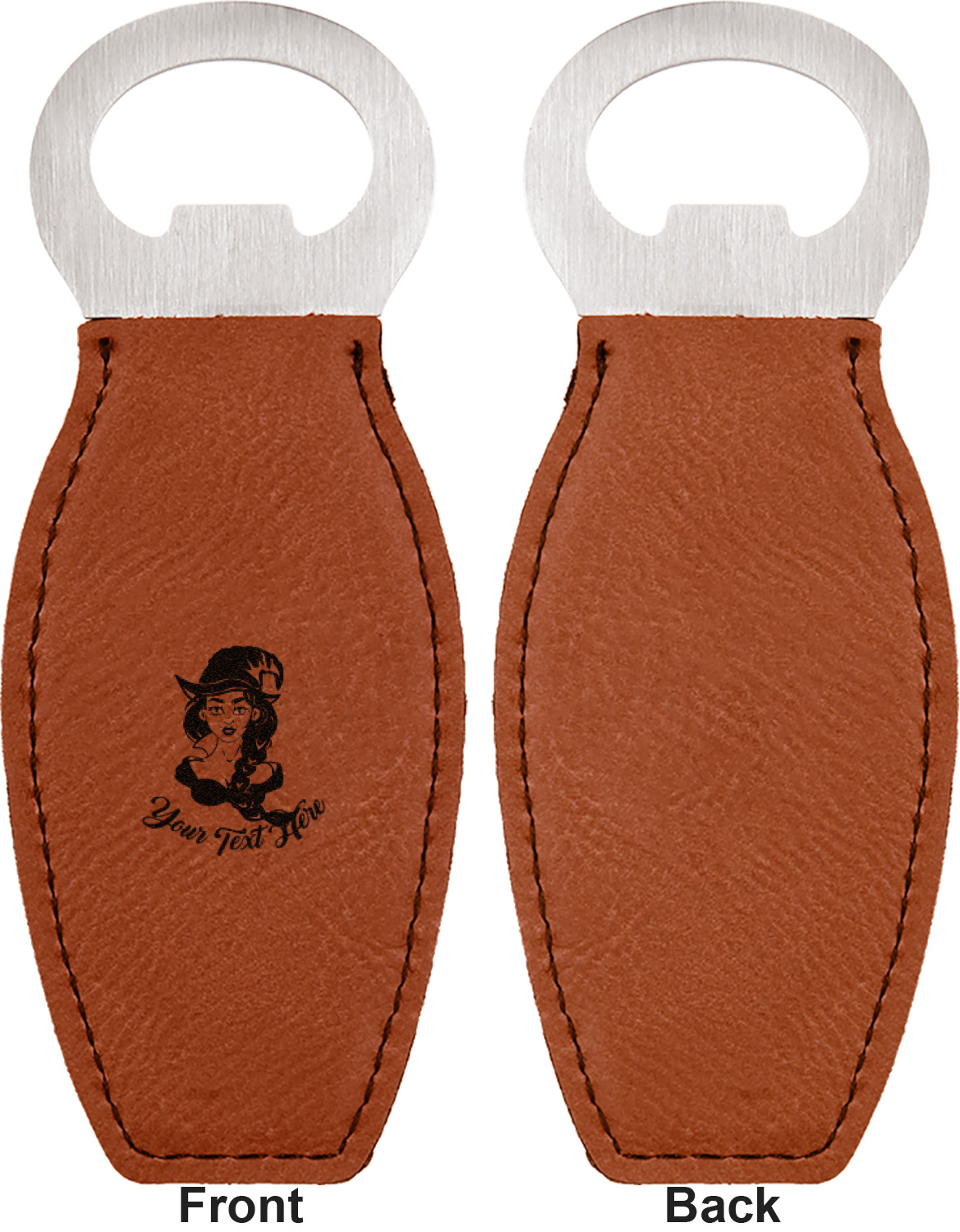 Built from stainless steel, these custom bottle openers are wrapped in a cognac-colored leatherette. Sharp, black stitching lines the edges for extra durability and a finished touch. Your personalization is laser-engraved onto the surface of this leatherette, leaving behind a crisp, black coloration. At 4.6 by 1.8 inches, this beer bottle opener gives you much of leverage when trying to open a stubborn bottle. On the opposite end of the opener, you'll find a magnet that you can use to display your new, unique bottle opener!