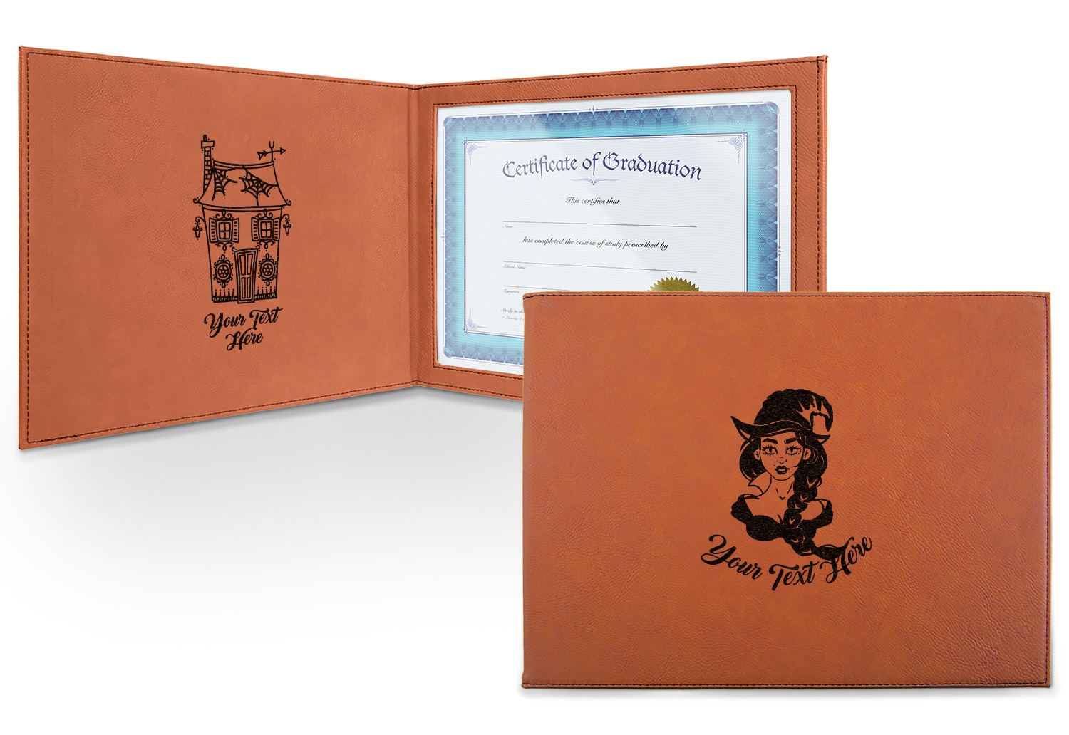 This cognac-colored, leatherette certificate jacket is the ideal way to display or store your hard-earned certificate. When closed, the custom certificate holder measures at 12 by 9 inches. The interior of the certificate cover includes a clear, vinyl window to encase your diploma. The window measures at around 10.5 by 7.5 inches and can accommodate a diploma that measures at up to 8.5 by 11 inches. You can either choose to have your customization laser engraved on the front and interior, or solely the front.