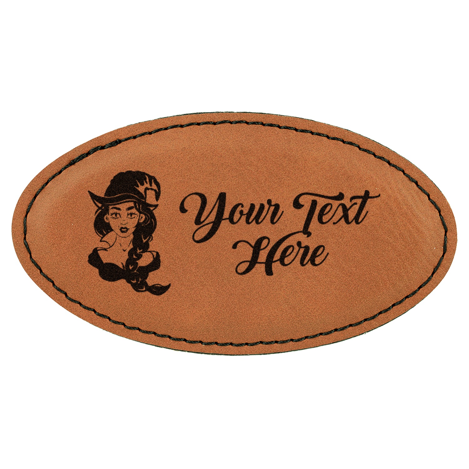 Made from a cognac-brown leatherette into an oval shape, these custom name badges measure at around 3.25" x 1.75". To add the suave appearance of this custom badge, a fine black stitching lines the edges or the badge itself. Your customized design is laser-engraved onto the surface of the leatherette. Accompanying your purchase is a removable magnet strip that can be used to secure the engraved name tag to any shirt, dress, or jacket.