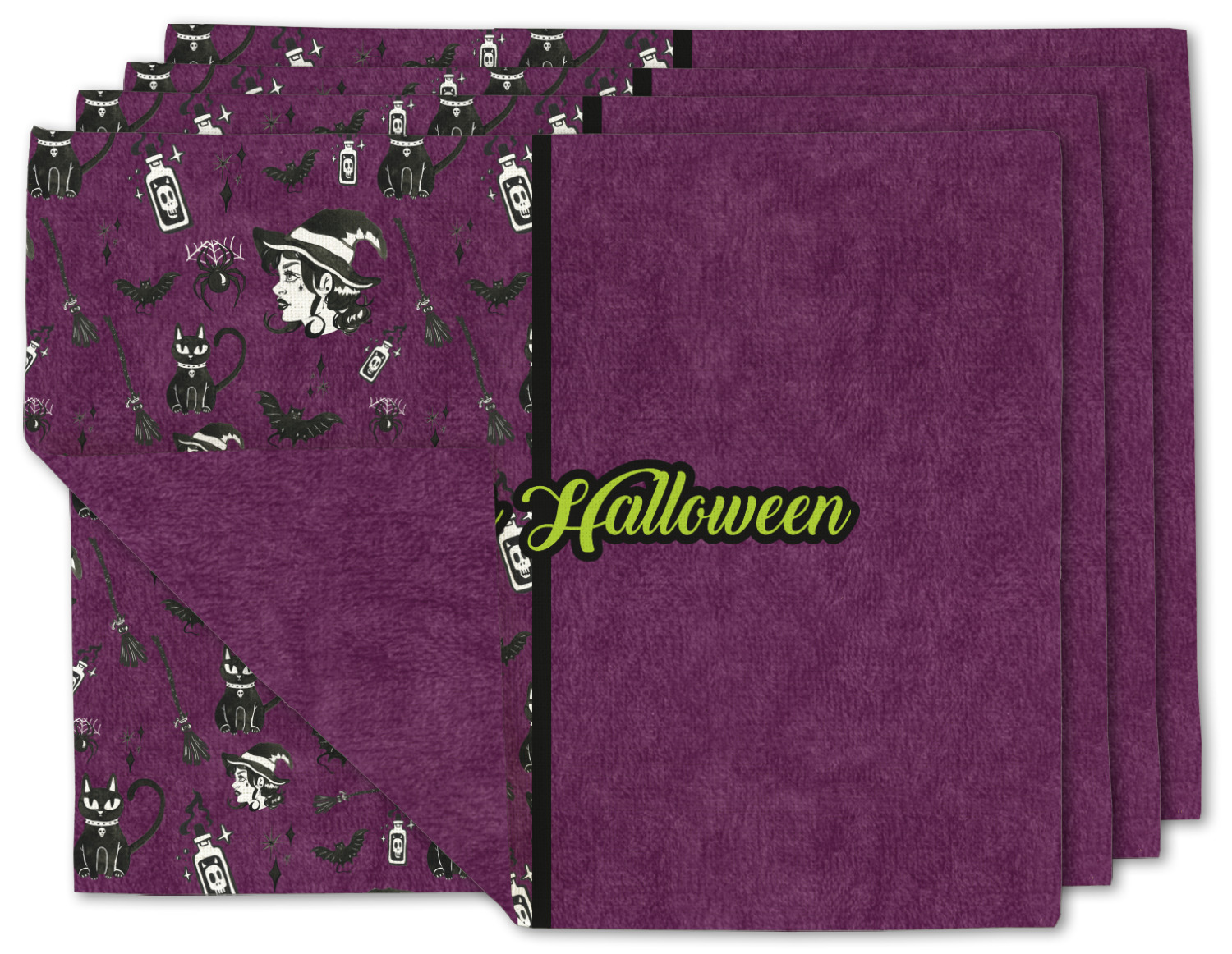 This fun design has a dark violet velvet looking (not real velvet - digital) background. On top of the digital velvet is a pattern full of beautiful illustrations of witches, potions, black cats, bats, and more. The main design is split in two with this background on one side and a plain violet digital velvet on the other. Your personalization is placed in the bottom right corner to give a lovely asymmetrical look. The coordinating design has a gorgeous large illustration of a witch with a little saying above and below her that says "I'll put a spell on you."