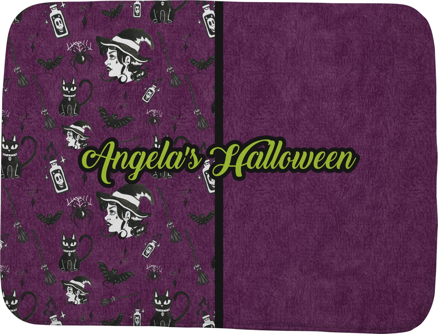 This fun design has a dark violet velvet looking (not real velvet - digital) background. On top of the digital velvet is a pattern full of beautiful illustrations of witches, potions, black cats, bats, and more. The main design is split in two with this background on one side and a plain violet digital velvet on the other. Your personalization is placed in the bottom right corner to give a lovely asymmetrical look. The coordinating design has a gorgeous large illustration of a witch with a little saying above and below her that says "I'll put a spell on you."