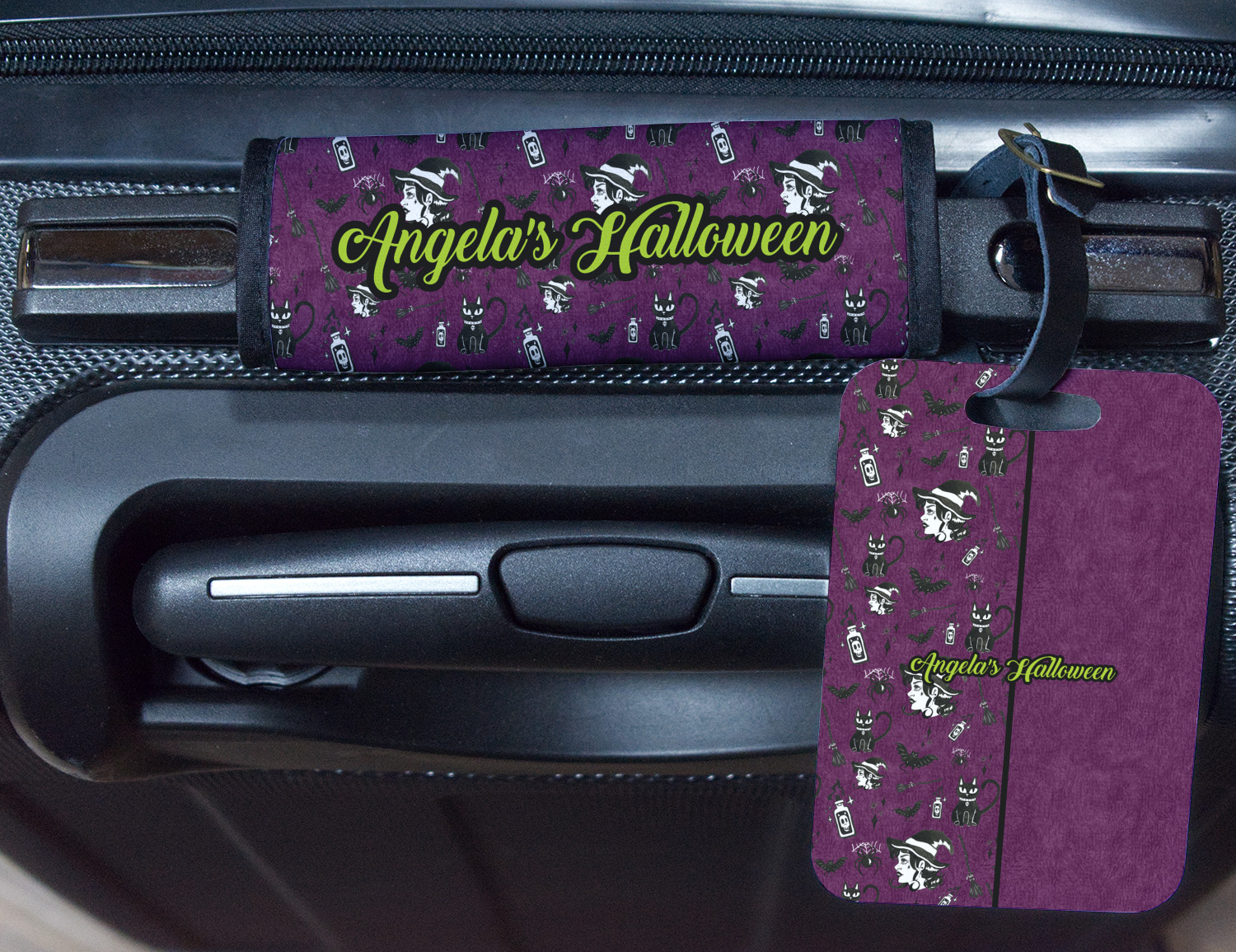 This fun design has a dark violet velvet looking (not real velvet - digital) background. On top of the digital velvet is a pattern full of beautiful illustrations of witches, potions, black cats, bats, and more. The main design is split in two with this background on one side and a plain violet digital velvet on the other. Your personalization is placed in the bottom right corner to give a lovely asymmetrical look. The coordinating design has a gorgeous large illustration of a witch with a little saying above and below her that says "I'll put a spell on you."