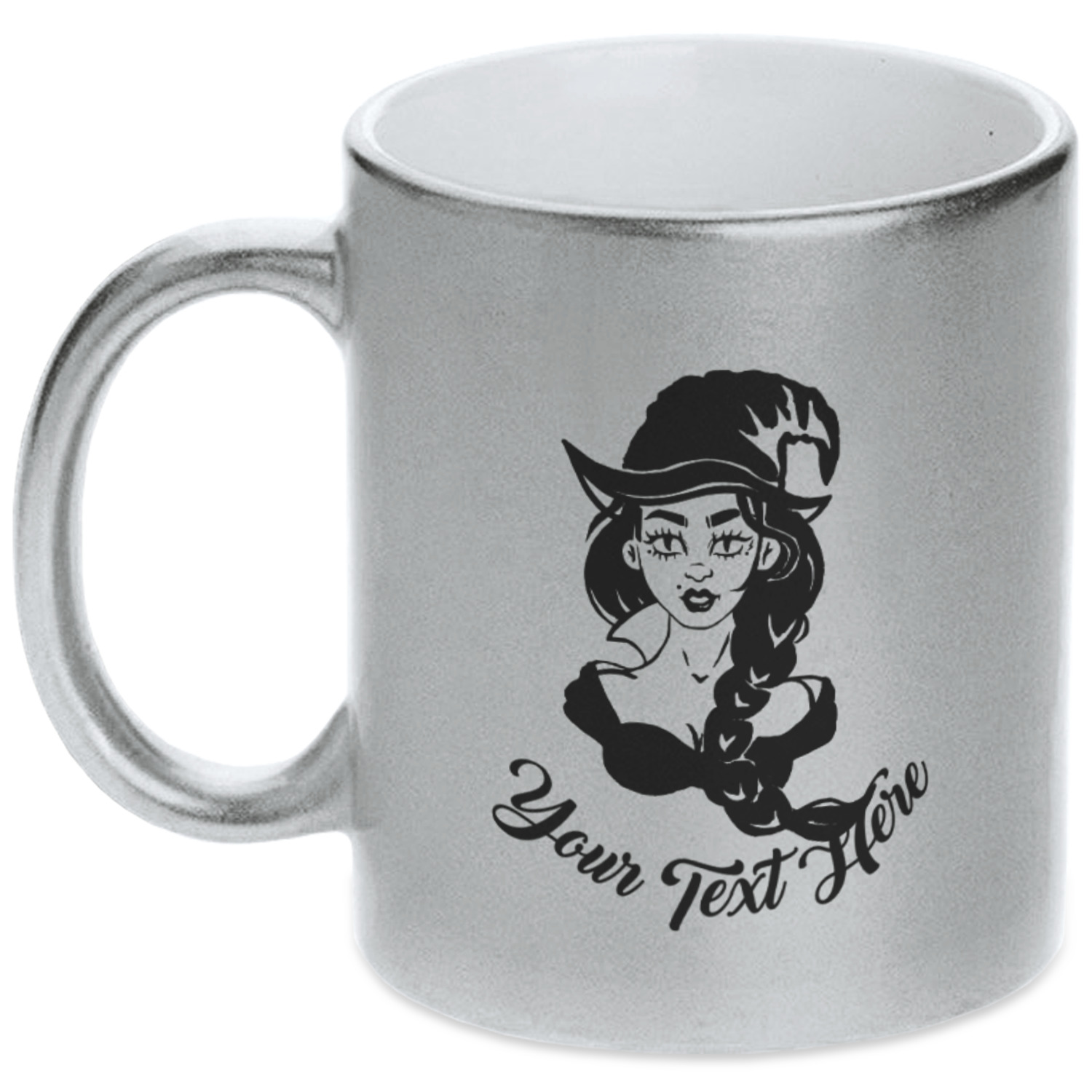 Our custom mugs are ceramic, which is great for keeping your tea or coffee warm! We offer two metallic mugs to personalize - Silver or Gold. Both styles hold around 11oz and have dimensions of approximately 3.75" x 3.5" x 4.75". Both the metallic mugs come in a matte finish and have glitter detailing to add a more pristine feel to the gold and silver base colors.