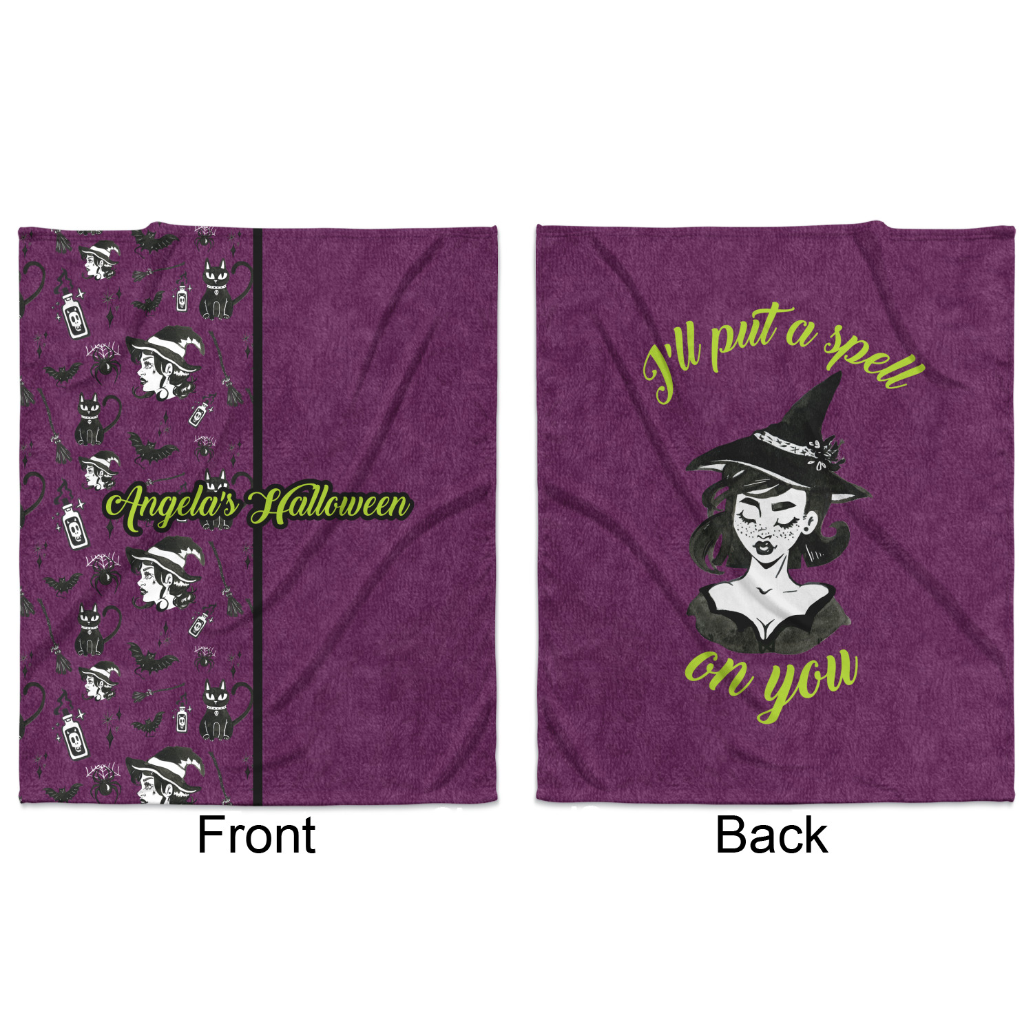 This fun design has a dark violet velvet looking (not real velvet - digital) background. On top of the digital velvet is a pattern full of beautiful illustrations of witches, potions, black cats, bats, and more. The main design is split in two with this background on one side and a plain violet digital velvet on the other. Your personalization is placed in the bottom right corner to give a lovely asymmetrical look. The coordinating design has a gorgeous large illustration of a witch with a little saying above and below her that says "I'll put a spell on you."