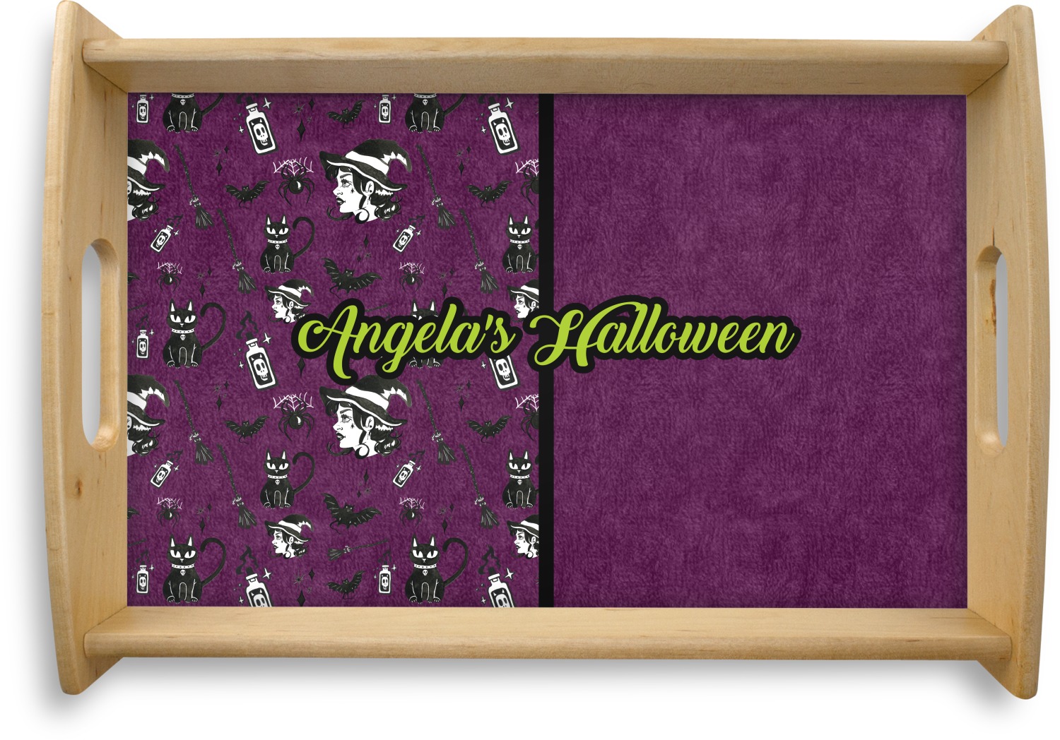 This serving tray with handles features square edges and two rounded sides, creating a very modern look. Each side is fabricated from a beautifully cut, natural wood. The bottom of the interior of the tray displays your customized design in bright, vibrant color. The tray is sold in both a black color and a natural wood look. Each variation of the wood serving tray has two sizes: Small, which is 14" x 10" x 2.25", and Large, which is 19.5" x 13.5" x 2.75".