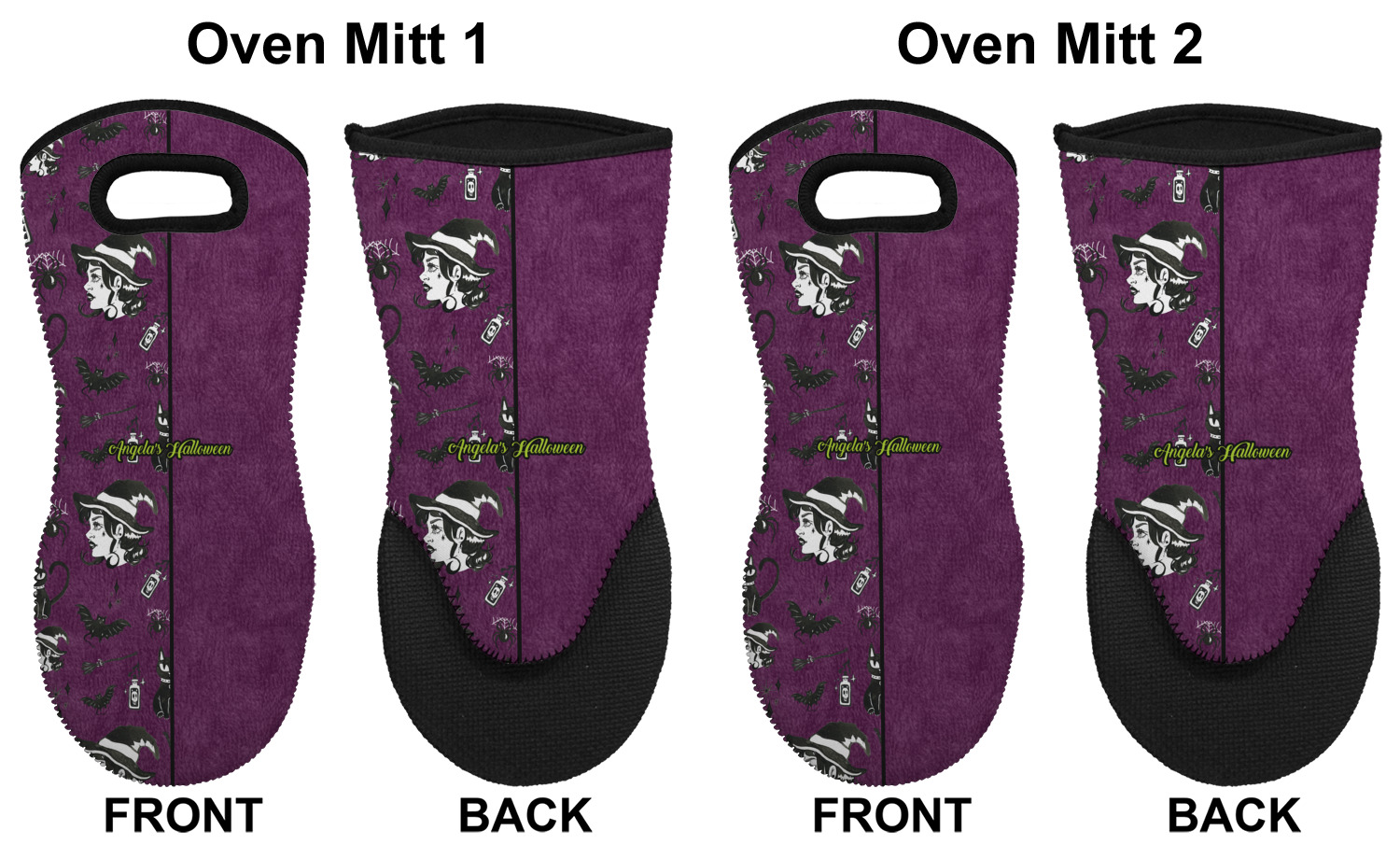 These heat resistant gloves are made entirely of a durable neoprene; the front features a softer texture, while the palm's side has a textured surface, meant to handle heat up to 500 degrees Fahrenheit. Thick, heavy duty stitching connects the two sides. A small, oval cutout appears on the front, and can be used to hang and store the mitt. Your personalization appears on the front, and the upper part of the back of the mitt. The style of these oven mitts are suitable for both the right and left hand, depending on your needs. If you need one for each hand, be sure to order two!
