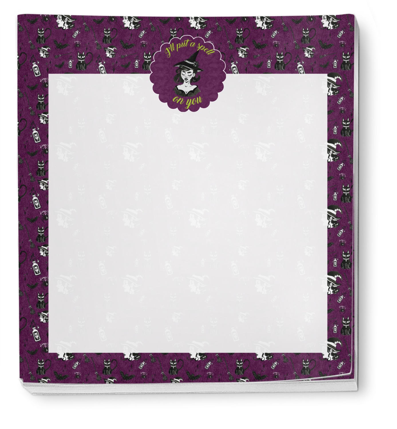 This fun design has a dark violet velvet looking (not real velvet - digital) background. On top of the digital velvet is a pattern full of beautiful illustrations of witches, potions, black cats, bats, and more. The main design is split in two with this background on one side and a plain violet digital velvet on the other. Your personalization is placed in the bottom right corner to give a lovely asymmetrical look. The coordinating design has a gorgeous large illustration of a witch with a little saying above and below her that says "I'll put a spell on you."
