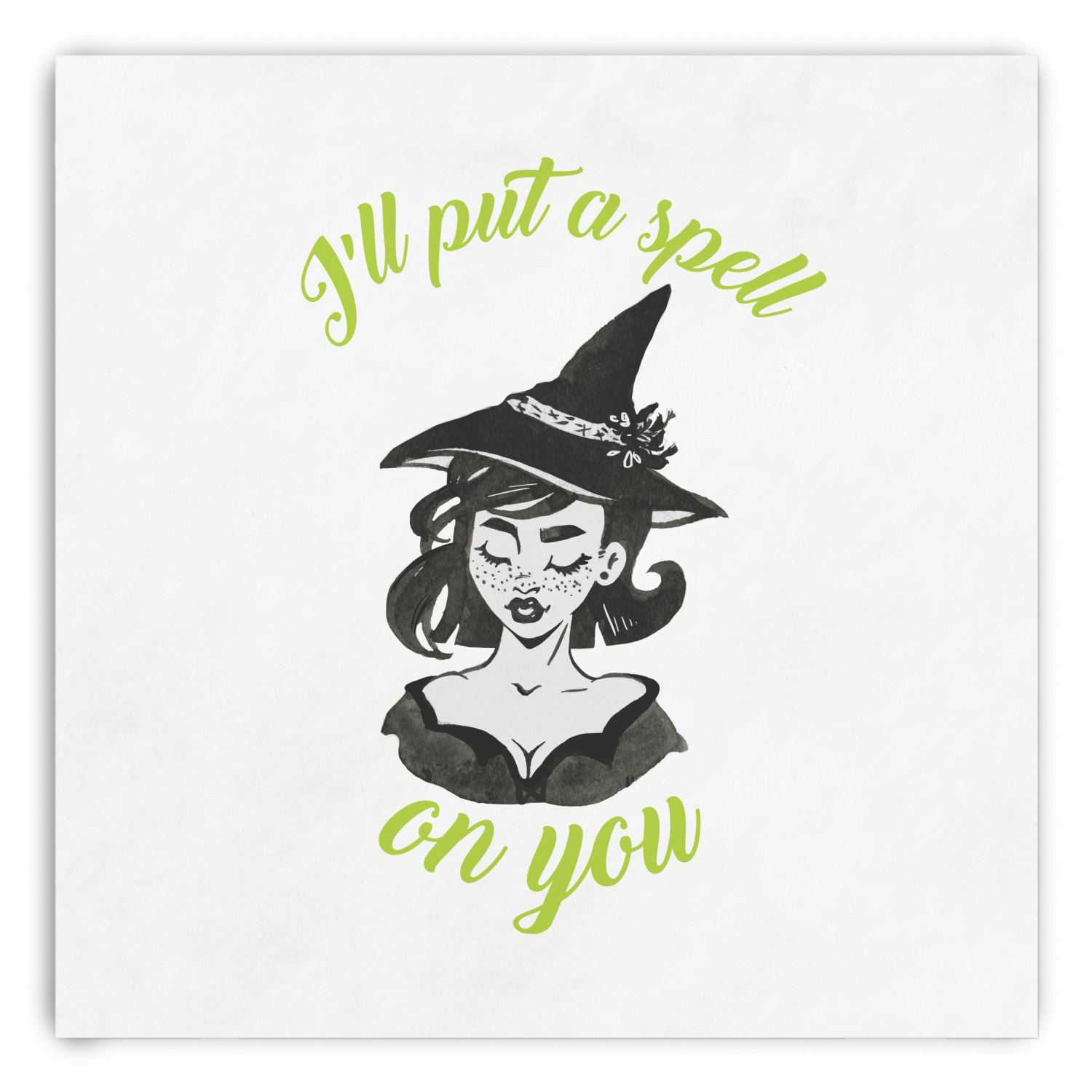 This fun design has a dark violet velvet looking (not real velvet - digital) background. On top of the digital velvet is a pattern full of beautiful illustrations of witches, potions, black cats, bats, and more. The main design is split in two with this background on one side and a plain violet digital velvet on the other. Your personalization is placed in the bottom right corner to give a lovely asymmetrical look. The coordinating design has a gorgeous large illustration of a witch with a little saying above and below her that says "I'll put a spell on you."