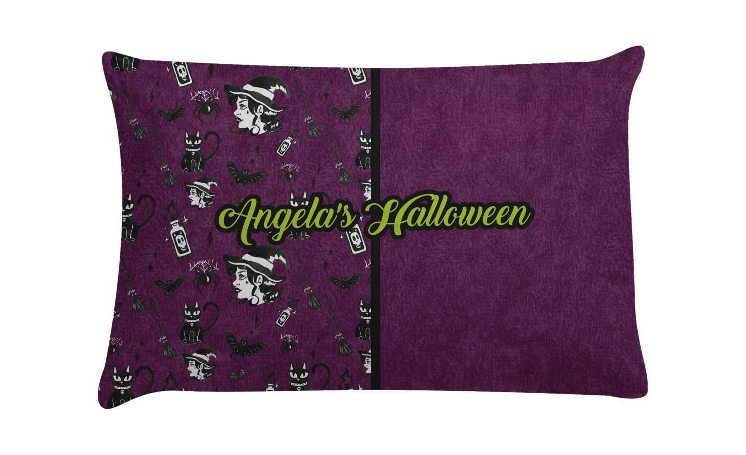 This fun design has a dark violet velvet looking (not real velvet - digital) background. On top of the digital velvet is a pattern full of beautiful illustrations of witches, potions, black cats, bats, and more. The main design is split in two with this background on one side and a plain violet digital velvet on the other. Your personalization is placed in the bottom right corner to give a lovely asymmetrical look. The coordinating design has a gorgeous large illustration of a witch with a little saying above and below her that says "I'll put a spell on you."