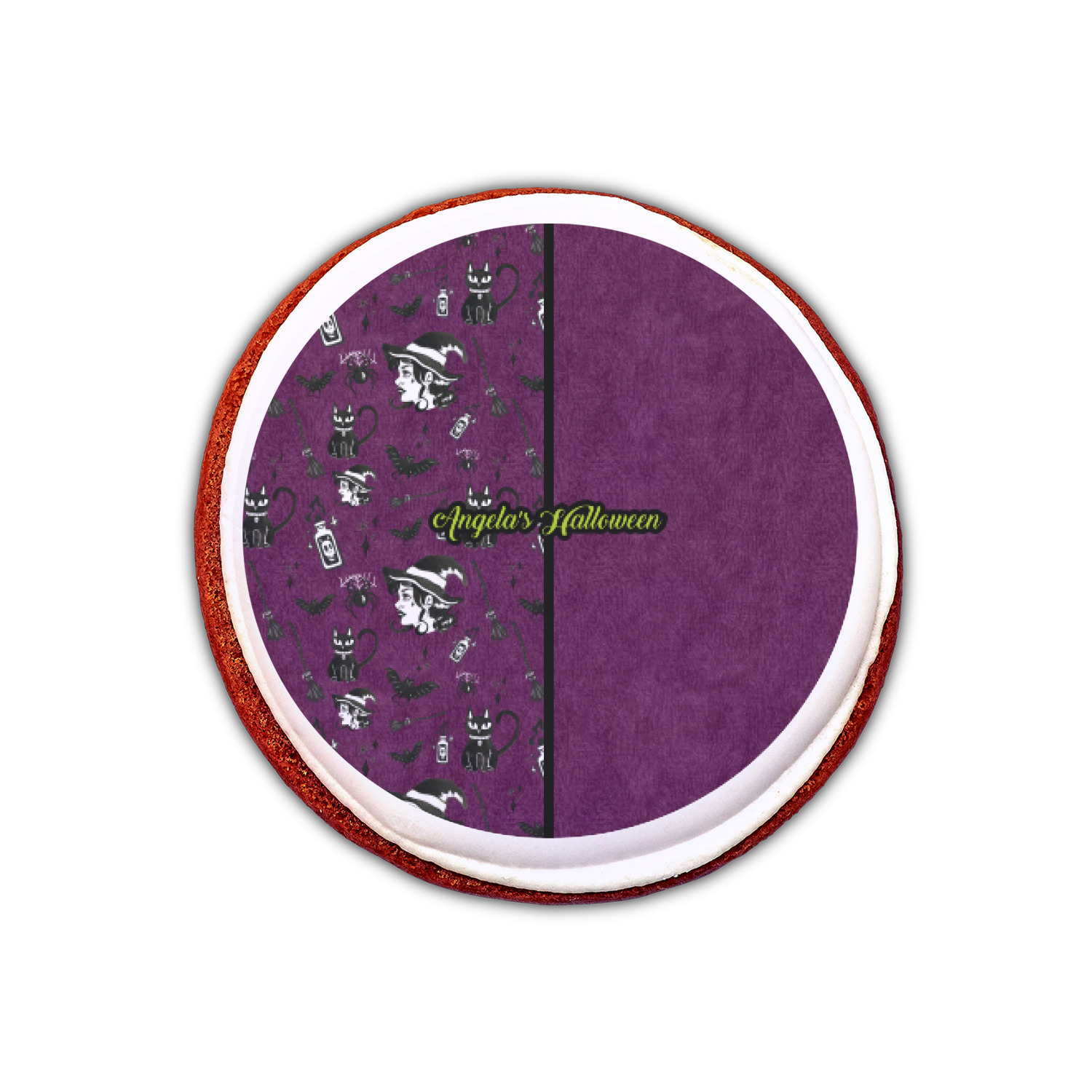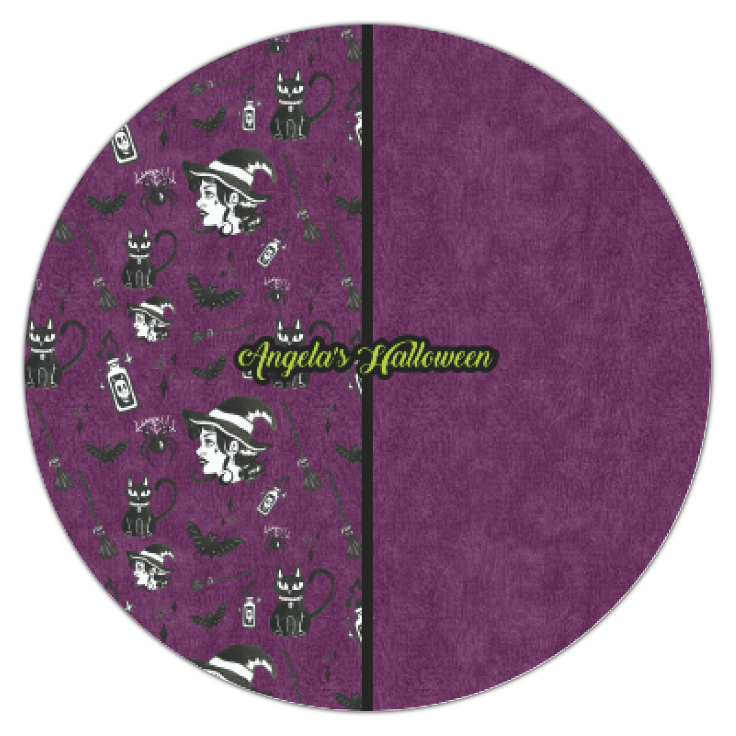 This fun design has a dark violet velvet looking (not real velvet - digital) background. On top of the digital velvet is a pattern full of beautiful illustrations of witches, potions, black cats, bats, and more. The main design is split in two with this background on one side and a plain violet digital velvet on the other. Your personalization is placed in the bottom right corner to give a lovely asymmetrical look. The coordinating design has a gorgeous large illustration of a witch with a little saying above and below her that says "I'll put a spell on you."