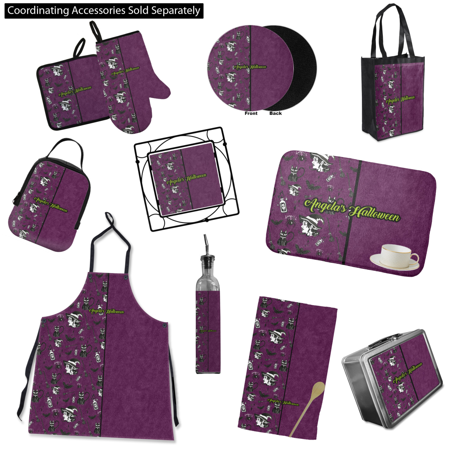 This fun design has a dark violet velvet looking (not real velvet - digital) background. On top of the digital velvet is a pattern full of beautiful illustrations of witches, potions, black cats, bats, and more. The main design is split in two with this background on one side and a plain violet digital velvet on the other. Your personalization is placed in the bottom right corner to give a lovely asymmetrical look. The coordinating design has a gorgeous large illustration of a witch with a little saying above and below her that says "I'll put a spell on you."