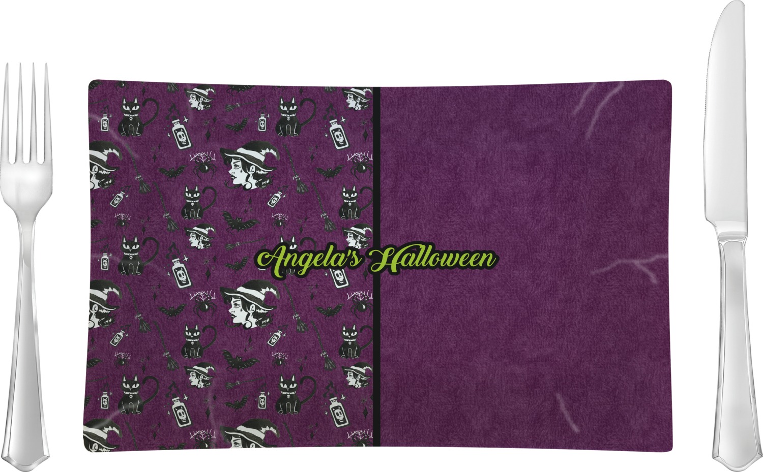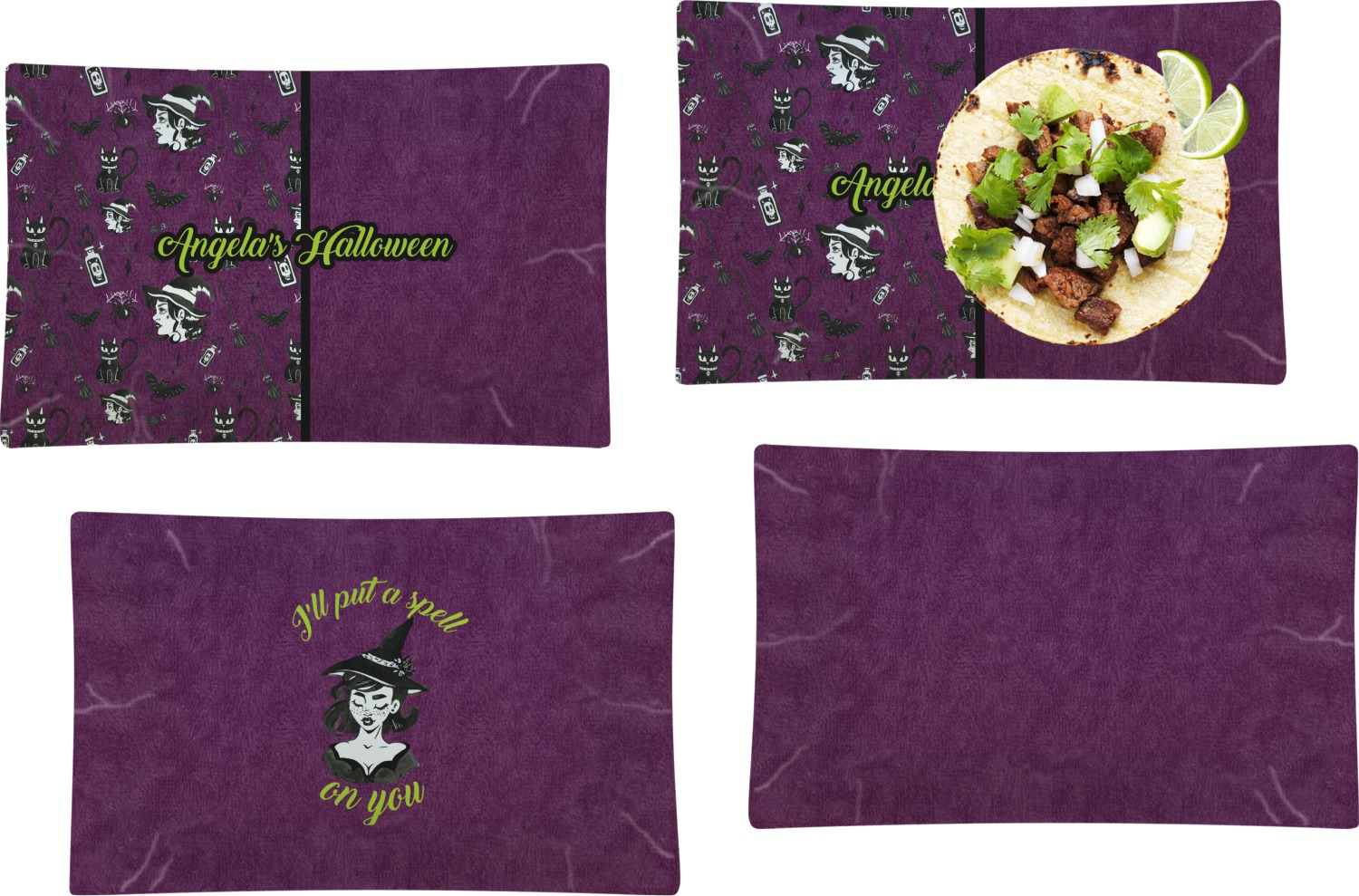 This fun design has a dark violet velvet looking (not real velvet - digital) background. On top of the digital velvet is a pattern full of beautiful illustrations of witches, potions, black cats, bats, and more. The main design is split in two with this background on one side and a plain violet digital velvet on the other. Your personalization is placed in the bottom right corner to give a lovely asymmetrical look. The coordinating design has a gorgeous large illustration of a witch with a little saying above and below her that says "I'll put a spell on you."
