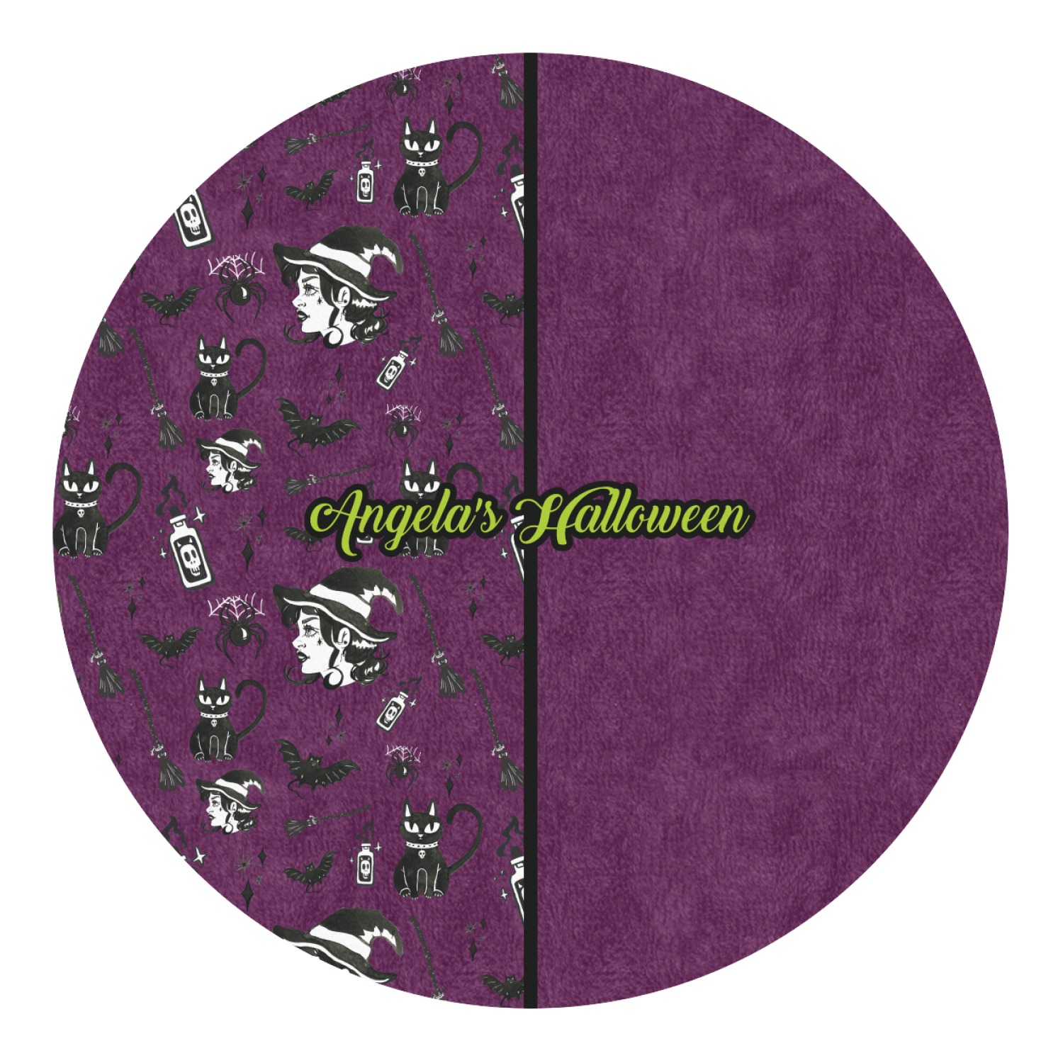 This fun design has a dark violet velvet looking (not real velvet - digital) background. On top of the digital velvet is a pattern full of beautiful illustrations of witches, potions, black cats, bats, and more. The main design is split in two with this background on one side and a plain violet digital velvet on the other. Your personalization is placed in the bottom right corner to give a lovely asymmetrical look. The coordinating design has a gorgeous large illustration of a witch with a little saying above and below her that says "I'll put a spell on you."