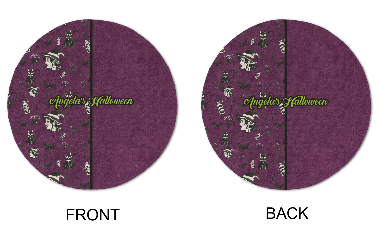 This fun design has a dark violet velvet looking (not real velvet - digital) background. On top of the digital velvet is a pattern full of beautiful illustrations of witches, potions, black cats, bats, and more. The main design is split in two with this background on one side and a plain violet digital velvet on the other. Your personalization is placed in the bottom right corner to give a lovely asymmetrical look. The coordinating design has a gorgeous large illustration of a witch with a little saying above and below her that says "I'll put a spell on you."