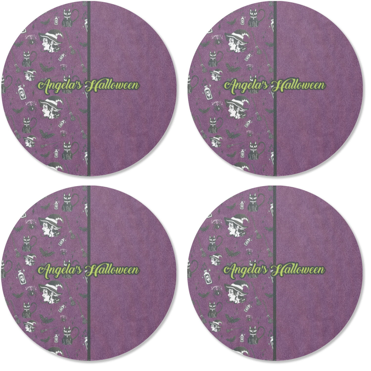 This fun design has a dark violet velvet looking (not real velvet - digital) background. On top of the digital velvet is a pattern full of beautiful illustrations of witches, potions, black cats, bats, and more. The main design is split in two with this background on one side and a plain violet digital velvet on the other. Your personalization is placed in the bottom right corner to give a lovely asymmetrical look. The coordinating design has a gorgeous large illustration of a witch with a little saying above and below her that says "I'll put a spell on you."