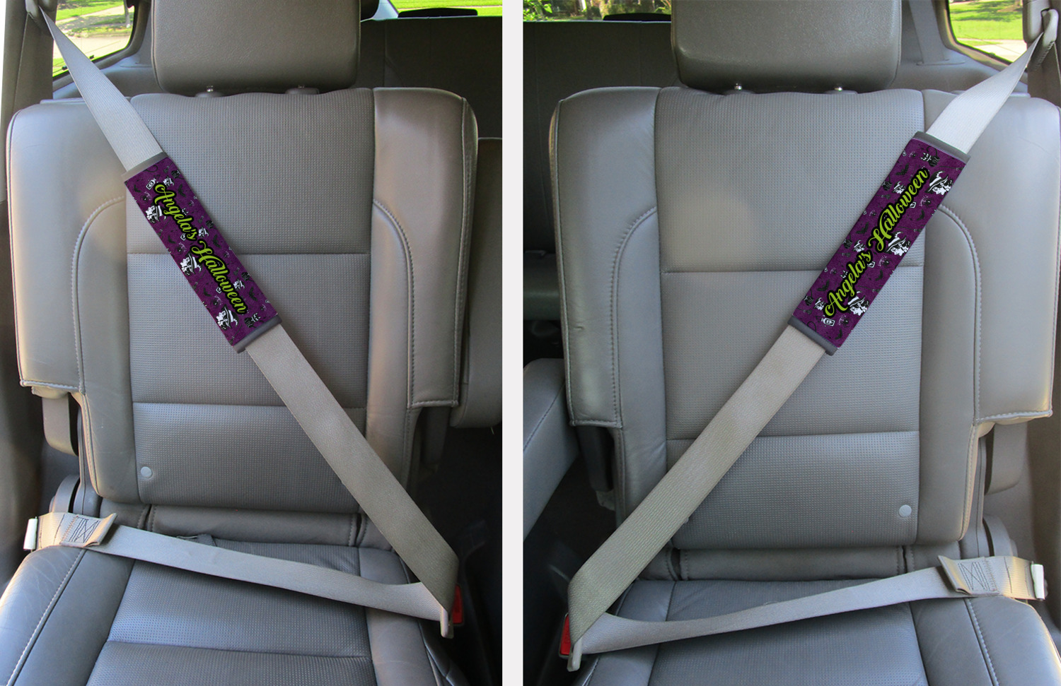 Made from neoprene, our seat belt strap covers wrap around the belt itself and have a Velcro tab for easy attachment and closure. The belt's edges are trimmed with a black polyester for a secure finish. Each cover is 9.5 by 7 inches when open and 9.5 by 2.5 inches when closed. We print your personalized design on the face of the seat belt pad.