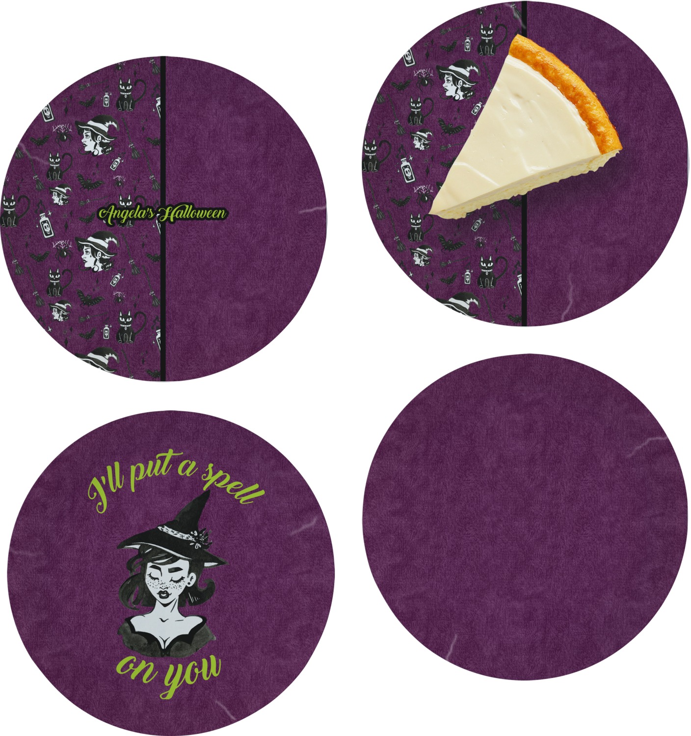 This fun design has a dark violet velvet looking (not real velvet - digital) background. On top of the digital velvet is a pattern full of beautiful illustrations of witches, potions, black cats, bats, and more. The main design is split in two with this background on one side and a plain violet digital velvet on the other. Your personalization is placed in the bottom right corner to give a lovely asymmetrical look. The coordinating design has a gorgeous large illustration of a witch with a little saying above and below her that says "I'll put a spell on you."