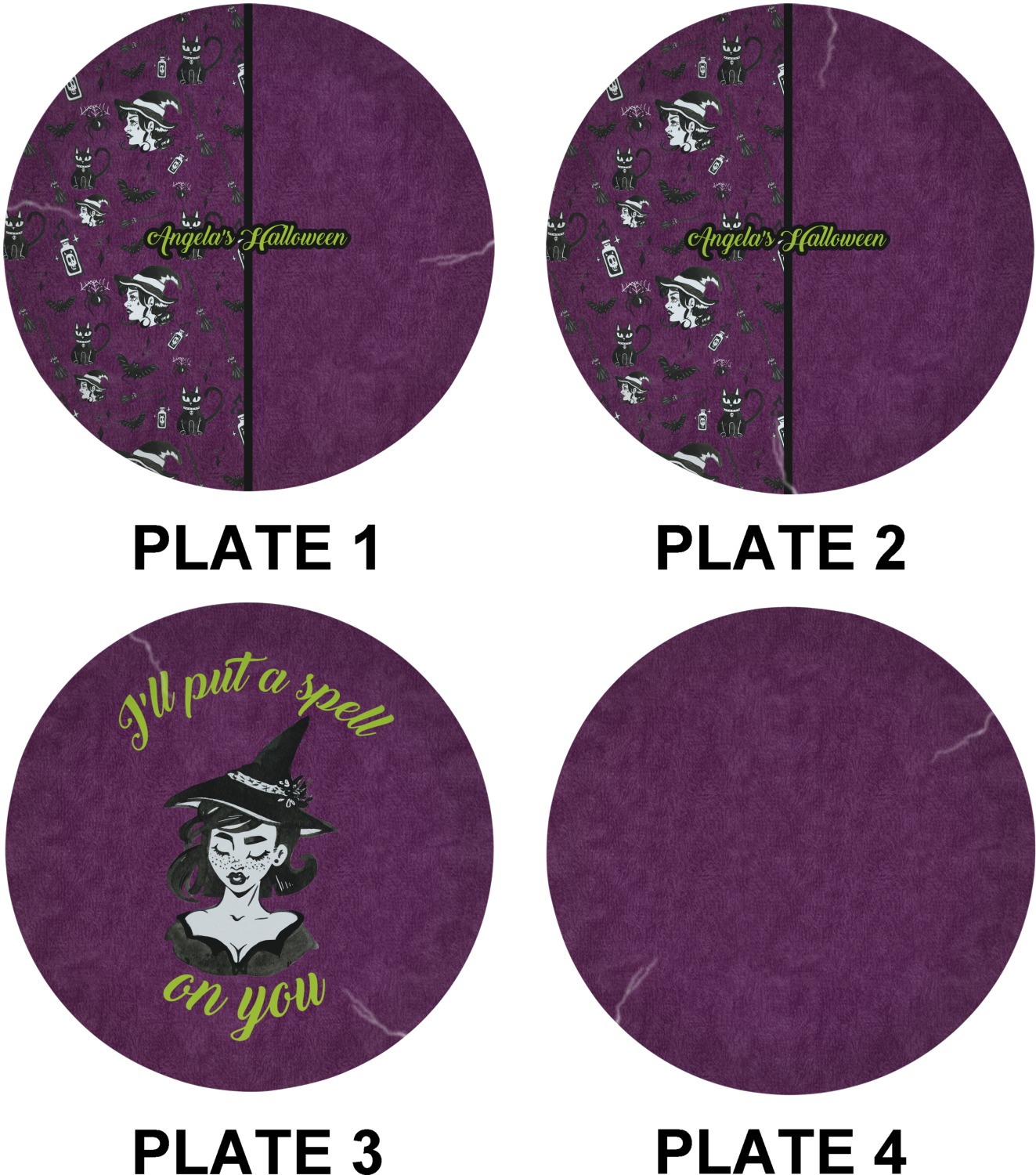 This fun design has a dark violet velvet looking (not real velvet - digital) background. On top of the digital velvet is a pattern full of beautiful illustrations of witches, potions, black cats, bats, and more. The main design is split in two with this background on one side and a plain violet digital velvet on the other. Your personalization is placed in the bottom right corner to give a lovely asymmetrical look. The coordinating design has a gorgeous large illustration of a witch with a little saying above and below her that says "I'll put a spell on you."