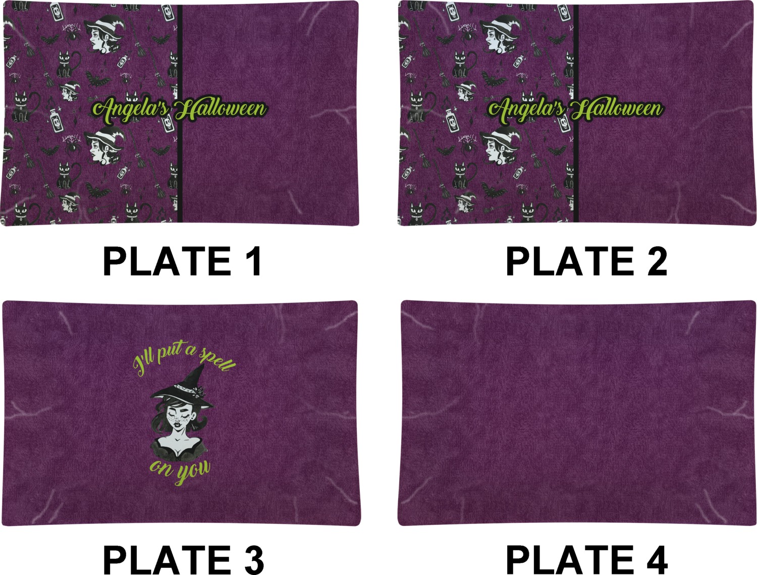 This fun design has a dark violet velvet looking (not real velvet - digital) background. On top of the digital velvet is a pattern full of beautiful illustrations of witches, potions, black cats, bats, and more. The main design is split in two with this background on one side and a plain violet digital velvet on the other. Your personalization is placed in the bottom right corner to give a lovely asymmetrical look. The coordinating design has a gorgeous large illustration of a witch with a little saying above and below her that says "I'll put a spell on you."