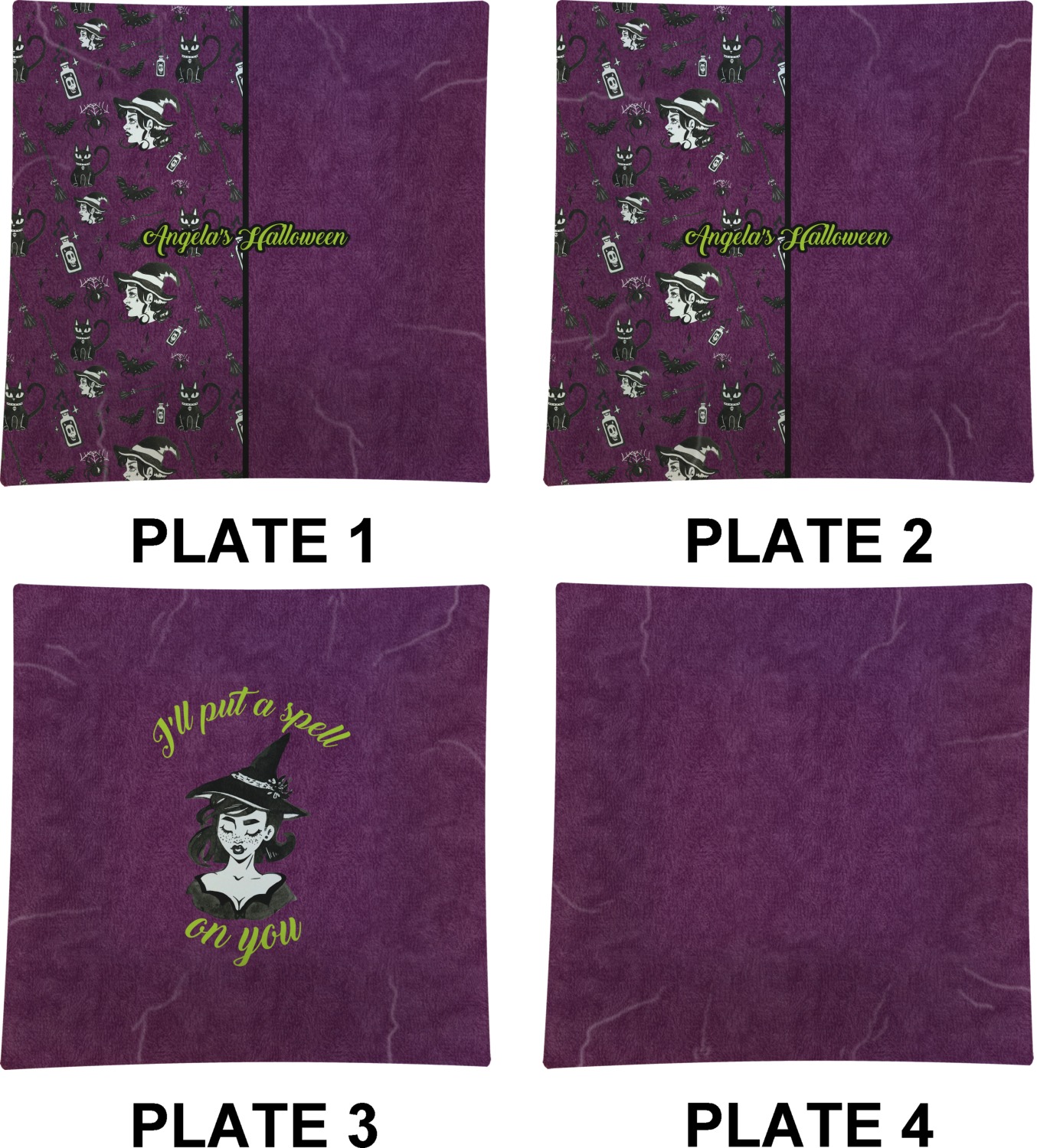 This fun design has a dark violet velvet looking (not real velvet - digital) background. On top of the digital velvet is a pattern full of beautiful illustrations of witches, potions, black cats, bats, and more. The main design is split in two with this background on one side and a plain violet digital velvet on the other. Your personalization is placed in the bottom right corner to give a lovely asymmetrical look. The coordinating design has a gorgeous large illustration of a witch with a little saying above and below her that says "I'll put a spell on you."