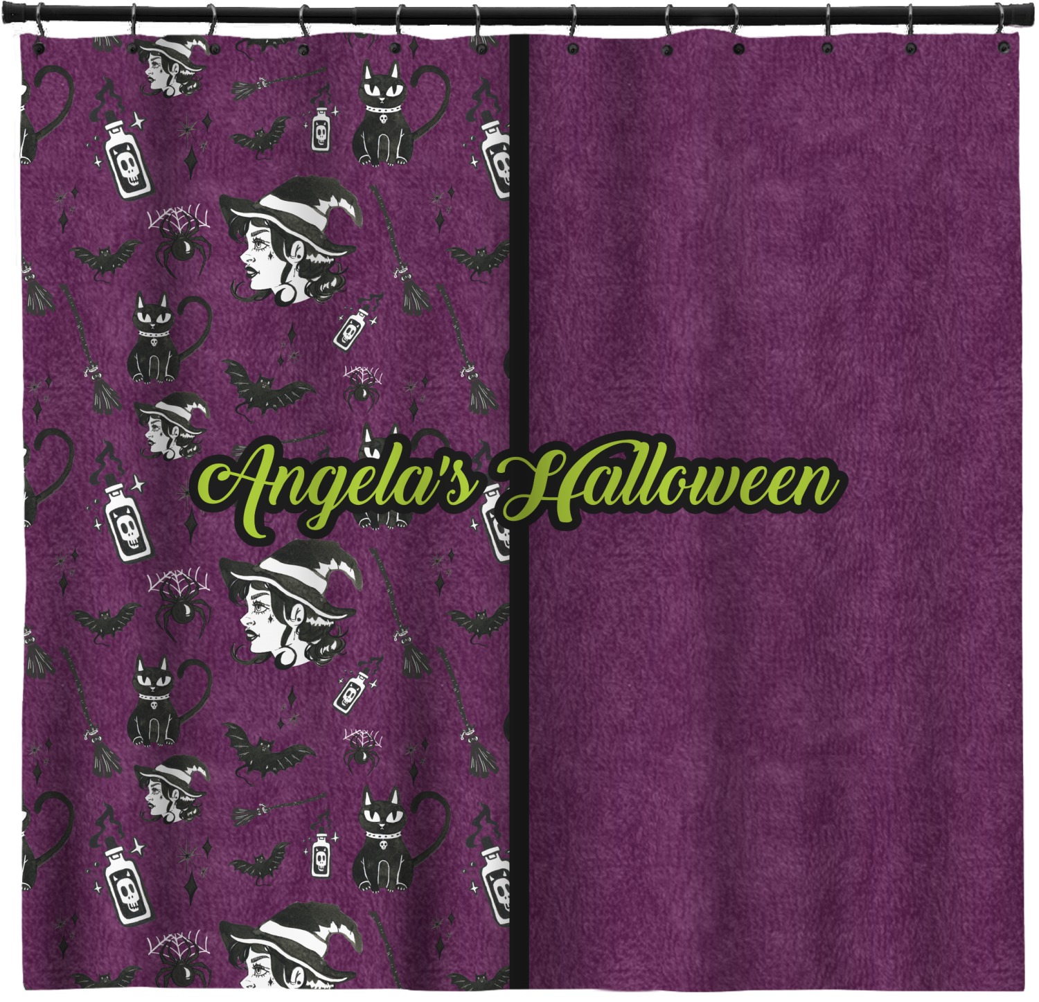 This fun design has a dark violet velvet looking (not real velvet - digital) background. On top of the digital velvet is a pattern full of beautiful illustrations of witches, potions, black cats, bats, and more. The main design is split in two with this background on one side and a plain violet digital velvet on the other. Your personalization is placed in the bottom right corner to give a lovely asymmetrical look. The coordinating design has a gorgeous large illustration of a witch with a little saying above and below her that says "I'll put a spell on you."