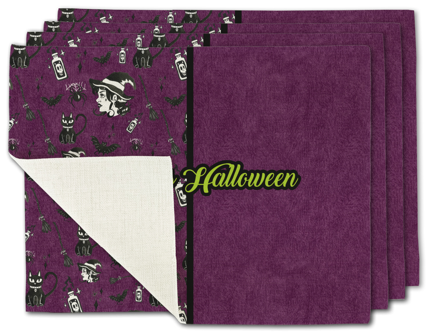 This fun design has a dark violet velvet looking (not real velvet - digital) background. On top of the digital velvet is a pattern full of beautiful illustrations of witches, potions, black cats, bats, and more. The main design is split in two with this background on one side and a plain violet digital velvet on the other. Your personalization is placed in the bottom right corner to give a lovely asymmetrical look. The coordinating design has a gorgeous large illustration of a witch with a little saying above and below her that says "I'll put a spell on you."