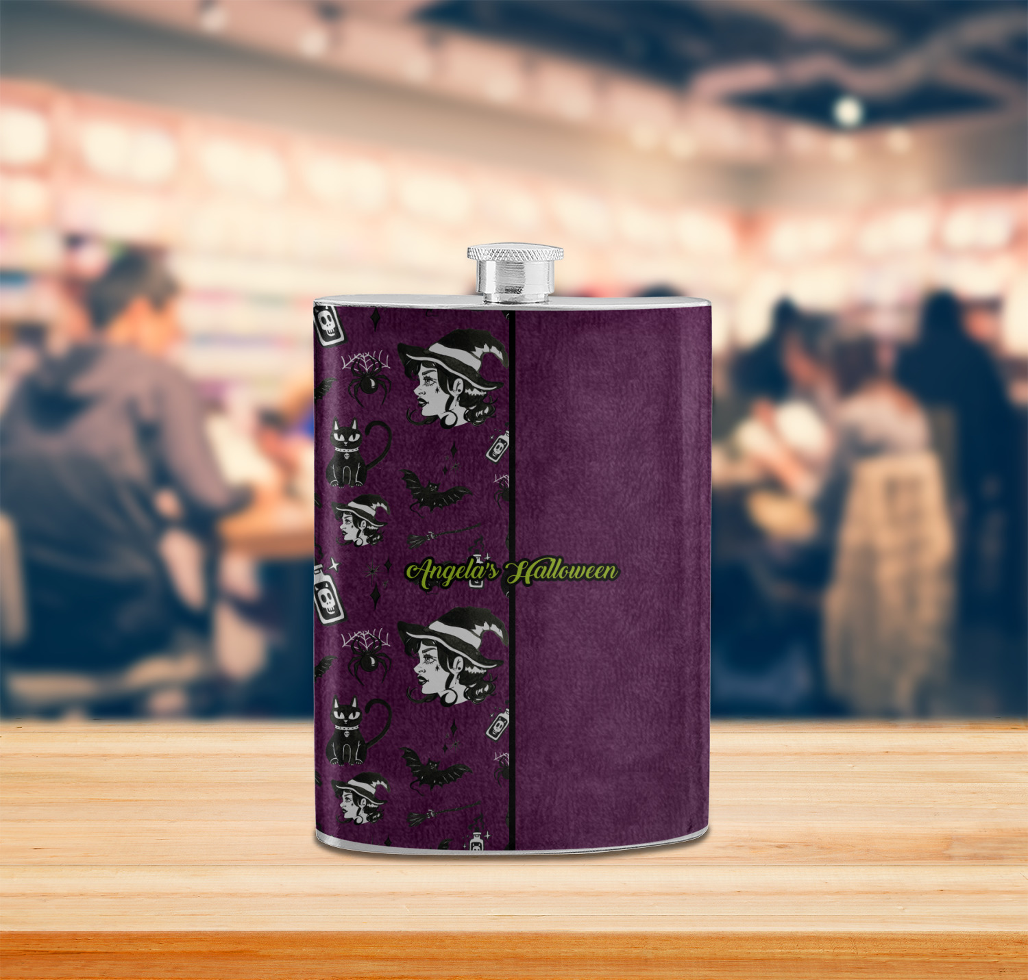 This fun design has a dark violet velvet looking (not real velvet - digital) background. On top of the digital velvet is a pattern full of beautiful illustrations of witches, potions, black cats, bats, and more. The main design is split in two with this background on one side and a plain violet digital velvet on the other. Your personalization is placed in the bottom right corner to give a lovely asymmetrical look. The coordinating design has a gorgeous large illustration of a witch with a little saying above and below her that says "I'll put a spell on you."