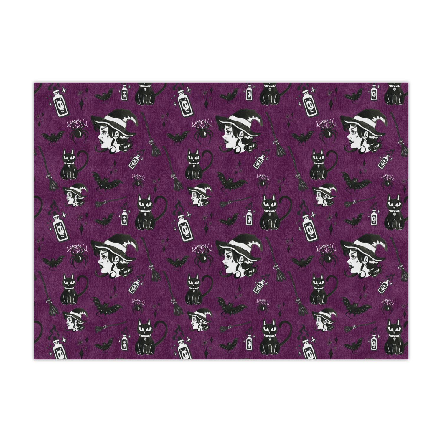 This fun design has a dark violet velvet looking (not real velvet - digital) background. On top of the digital velvet is a pattern full of beautiful illustrations of witches, potions, black cats, bats, and more. The main design is split in two with this background on one side and a plain violet digital velvet on the other. Your personalization is placed in the bottom right corner to give a lovely asymmetrical look. The coordinating design has a gorgeous large illustration of a witch with a little saying above and below her that says "I'll put a spell on you."