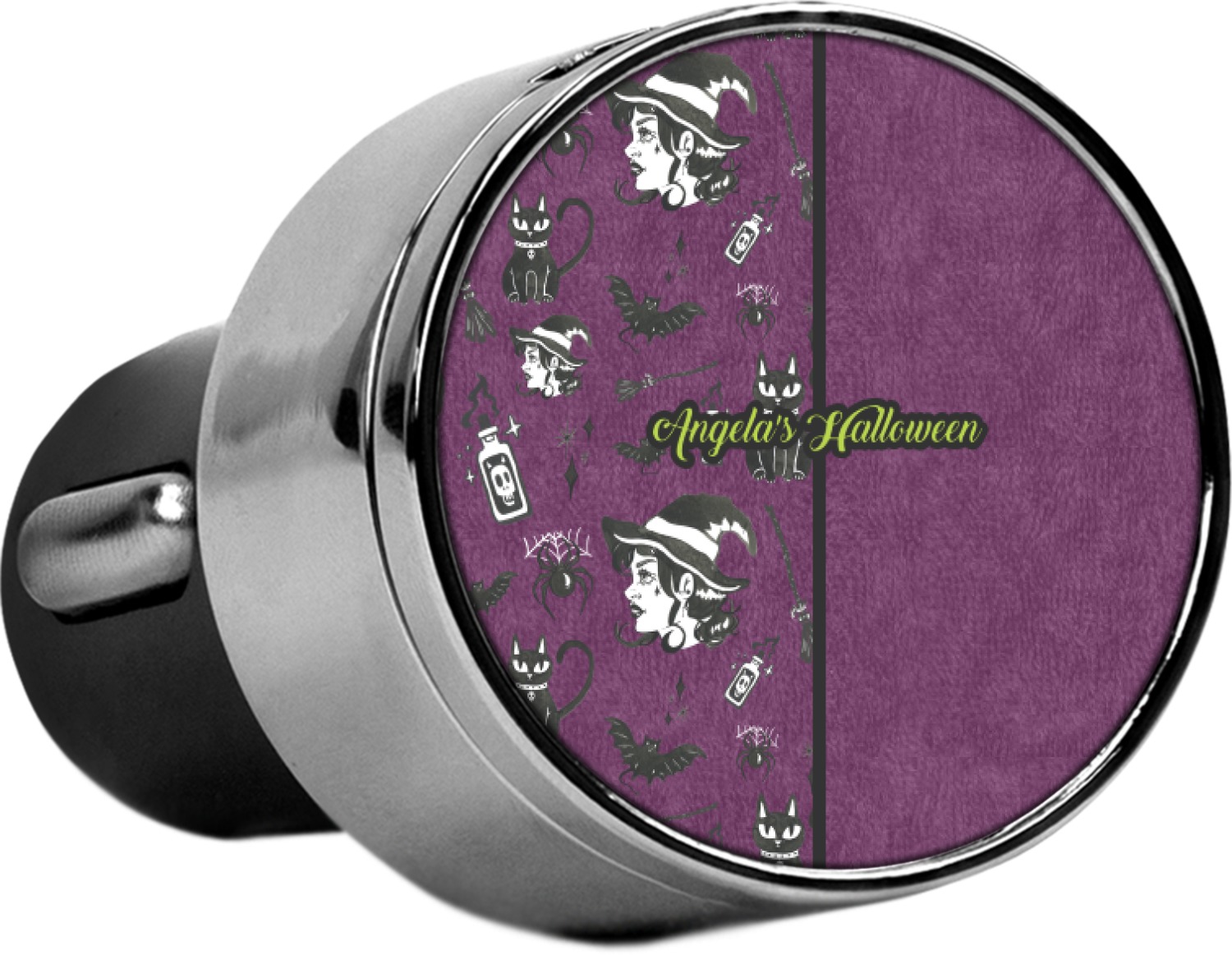 This car charger adapter converts your cars bland cigarette lighter into a decorative, personalized, and operational USB charging port. Made of solid, silver-plated metal, these chargers feature a flip-open lid that both displays your customized design and conceals two USB ports. The metal lid of the USB car charger adapter is 1.5" in diameter and seals due to a small, ingrained magnet on both the charger and its lid. The cigarette lighter insert, itself, is colored black.