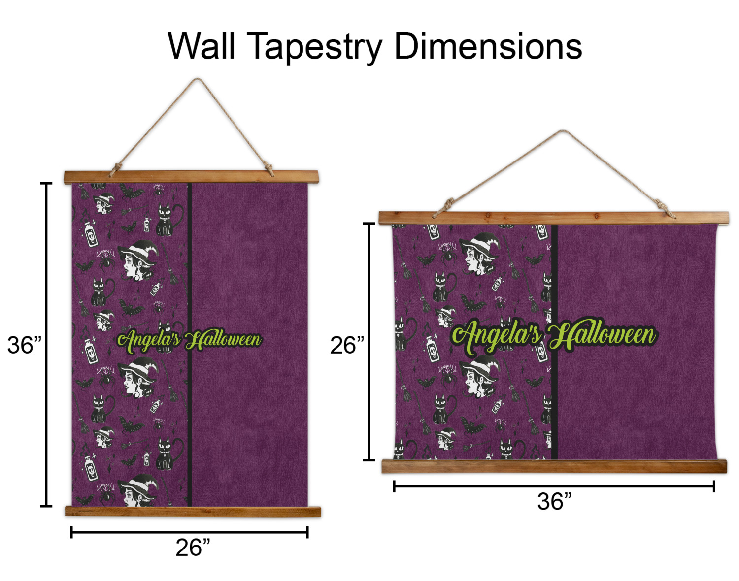 Made in two different orientations - portrait or landscape - both are 26" x 36". Your design is printed on a high quality polyester fabric with hemmed edges. The wood on the top and bottom of the tapestry is 1.25" tall and 0.25" thick and there are two pieces on top and bottom which sandwich the fabric.