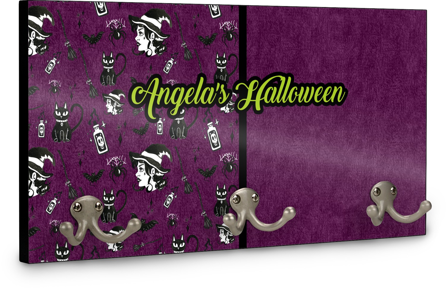 This coat rack is the perfect way to add some personality to your wall or entryway. The board is made of a strong maple that is approximately 16" x 8". The three 2-prong hooks are a sturdy metal that have three screws attaching them to the board. Your design is printed right onto the front of the board while the back and sides are a simple black.