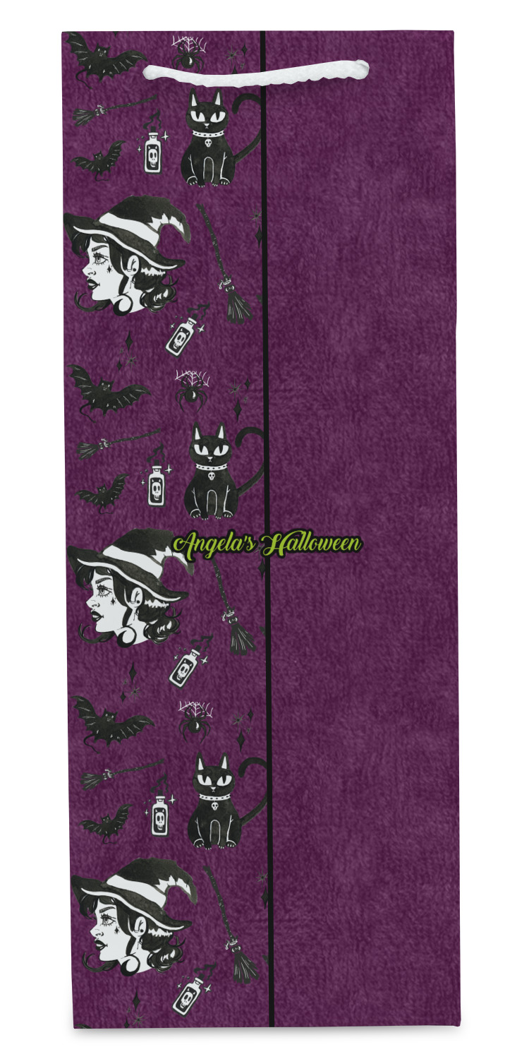 This fun design has a dark violet velvet looking (not real velvet - digital) background. On top of the digital velvet is a pattern full of beautiful illustrations of witches, potions, black cats, bats, and more. The main design is split in two with this background on one side and a plain violet digital velvet on the other. Your personalization is placed in the bottom right corner to give a lovely asymmetrical look. The coordinating design has a gorgeous large illustration of a witch with a little saying above and below her that says "I'll put a spell on you."