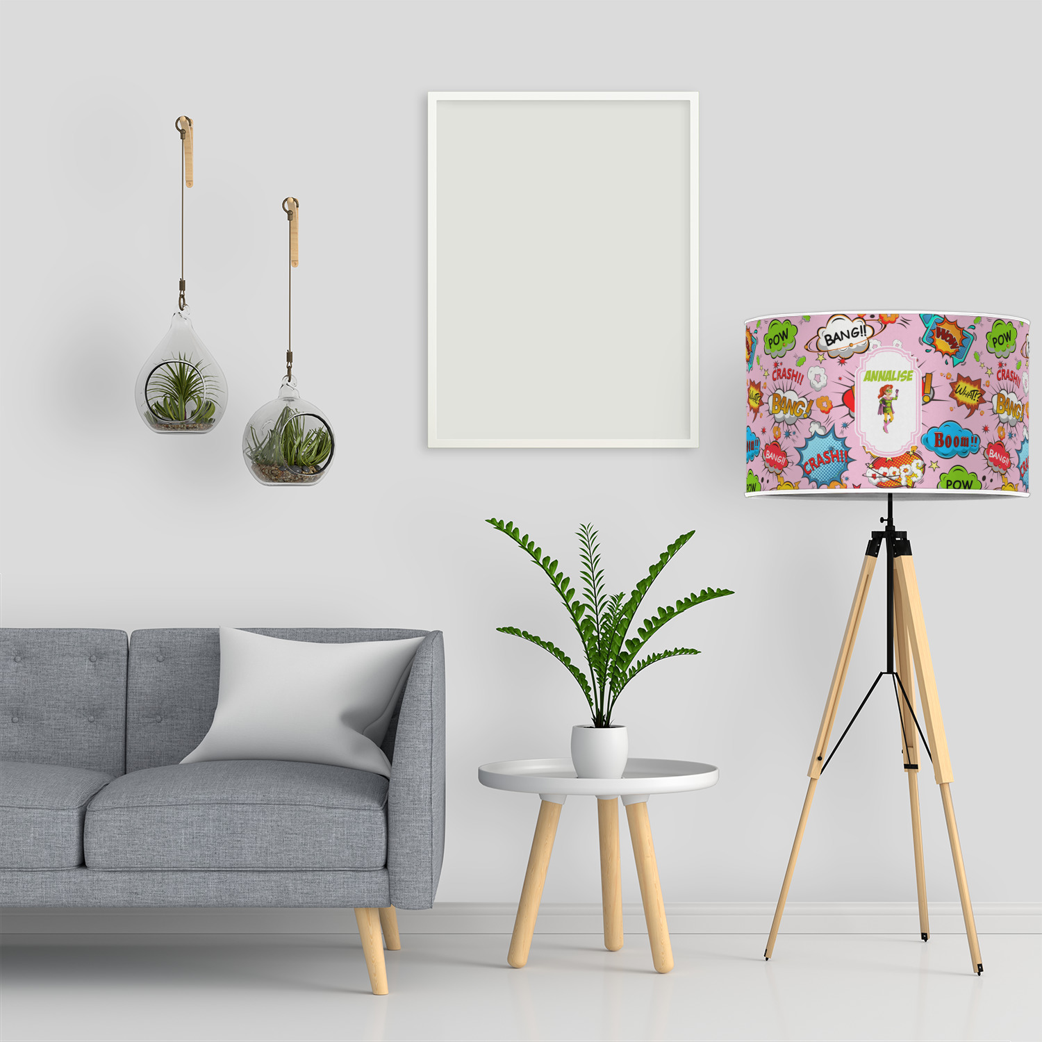 All our superhero women are fully re-color-able - so not only do you decide what color clothes they are wearing, you get to select their hair and skin color as well. So try out our customization system and see what you come up with. We chose a tall frame with the personalization on the top and colored it in matching pink.
