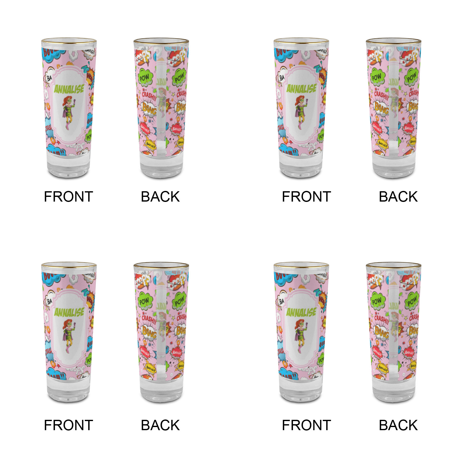 These glass shooter glasses are printed in full color with the design of your choice. These are a tall shooter 2 oz size and stand 4" tall. The print is a full wrap design to boldly display your personalization.